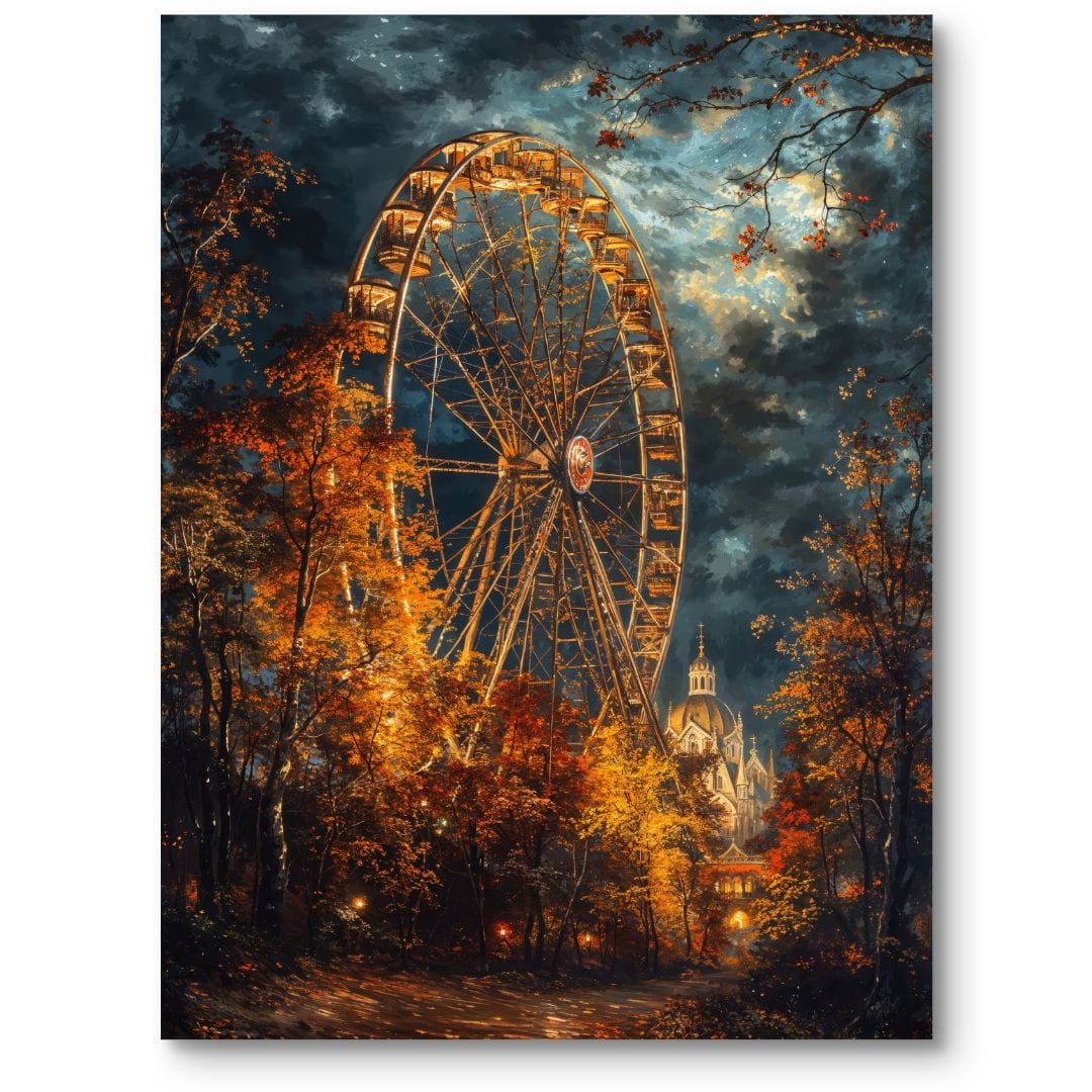 Ten niezwykle realistyczny plakat przenosi nas w magiczny, jesienny krajobraz, gdzie monumentalne diabelskie koło dominuje nad otoczeniem. W tle majaczy intrygujący budynek, przypominający majestatyczną katedrę, co dodaje całej scenerii wyjątkowego uroku i tajemniczej atmosfery. Paleta ciepłych, jesiennych barw – od głębokiego pomarańczu po złote refleksy – urzeka, kontrastując z dramatycznym, granatowym niebem.
