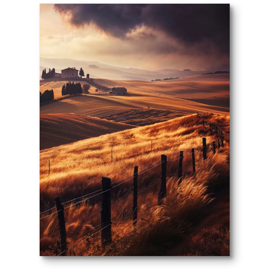 Plakat ukazuje malowniczy, wiejski krajobraz skąpany w złotych promieniach zachodzącego słońca. Na pierwszym planie rozciąga się polna droga, otoczona starannie wykonanymi, drewnianymi płotami. W oddali, na łagodnym wzgórzu, stoi sielski dom, a nad całą scenerią unosi się dramatyczne, ciemne niebo, dodające kompozycji niepowtarzalnej głębi oraz dynamiki.
