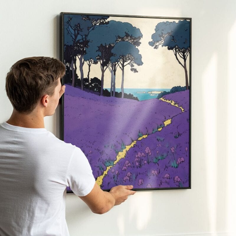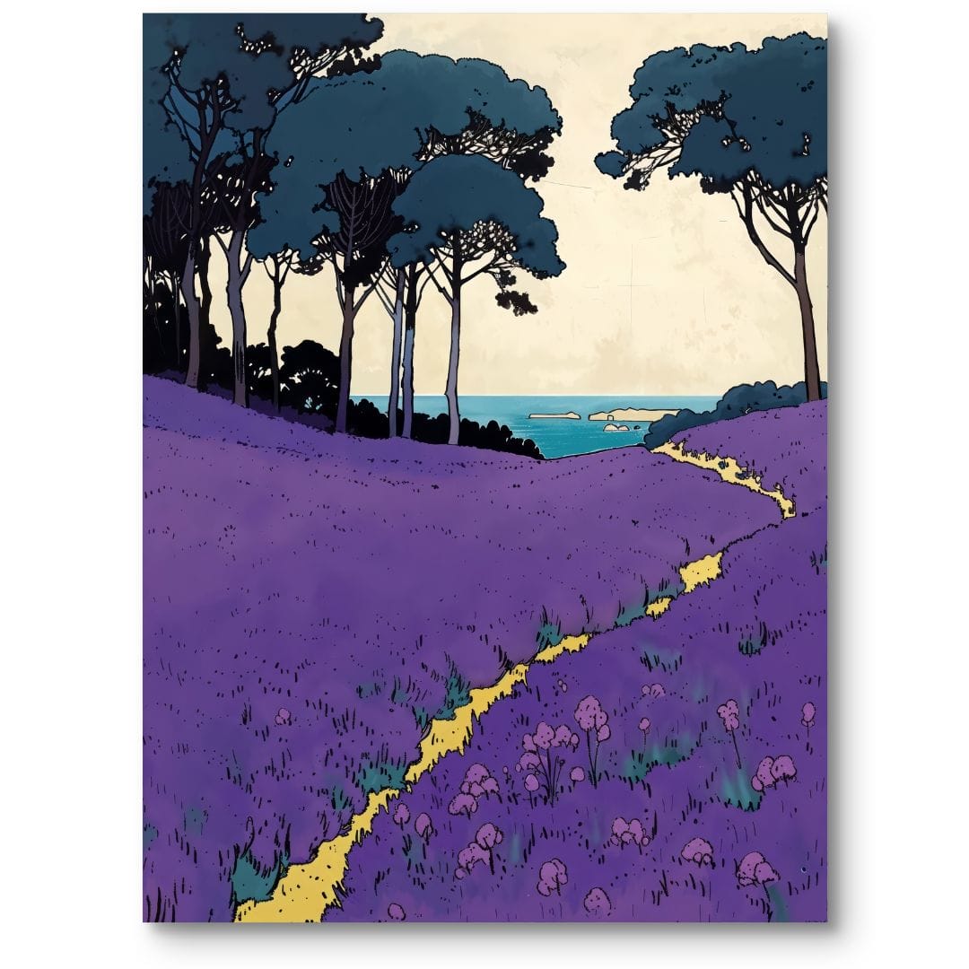 Ten plakat przedstawia malowniczą łąkę usianą fioletowymi kwiatami, przez środek której przebiega urocza, żółta ścieżka. W tle widać majestatyczne, wysokie drzewa oraz błękitną taflę morza, tworząc harmonijną, zapraszającą do wyciszenia kompozycję. Każdy element tej scenerii oddaje piękno natury i zachęca, by przenieść się choć na chwilę w spokojne jej zakątki.