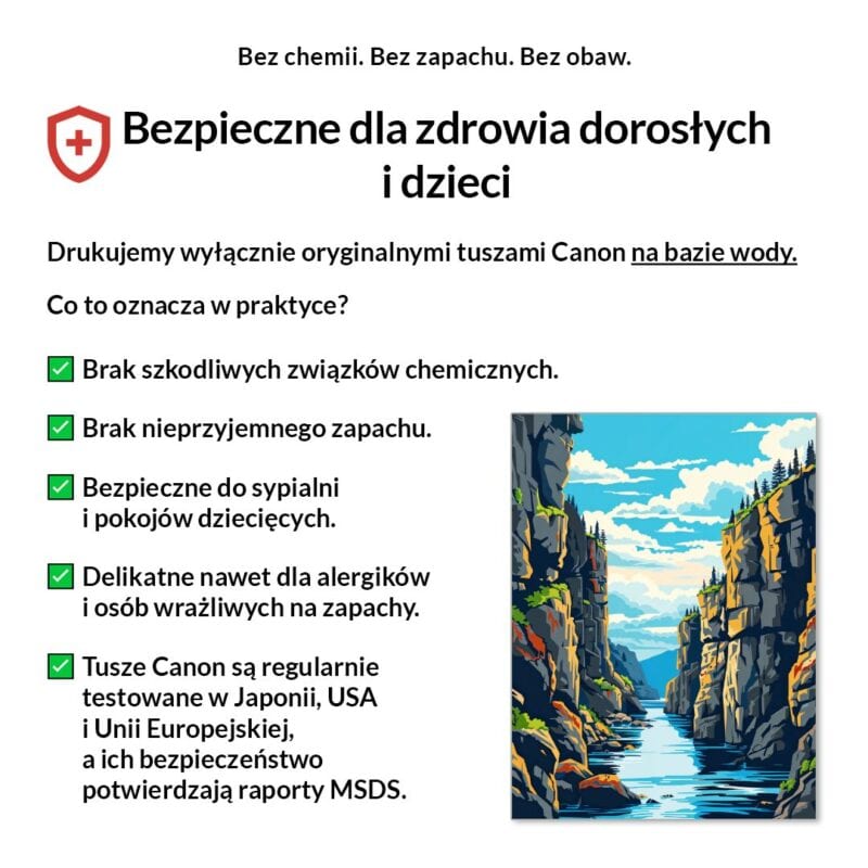 Tak, absolutnie! Drukujemy wyłącznie certyfikowanymi, bezwonnymi tuszami pigmentowymi Canon Lucia Pro na bazie wody. Są one w pełni bezpieczne dla zdrowia, nie zawierają rozpuszczalników i mogą być bez obaw stosowane w sypialniach i pokojach dziecięcych.