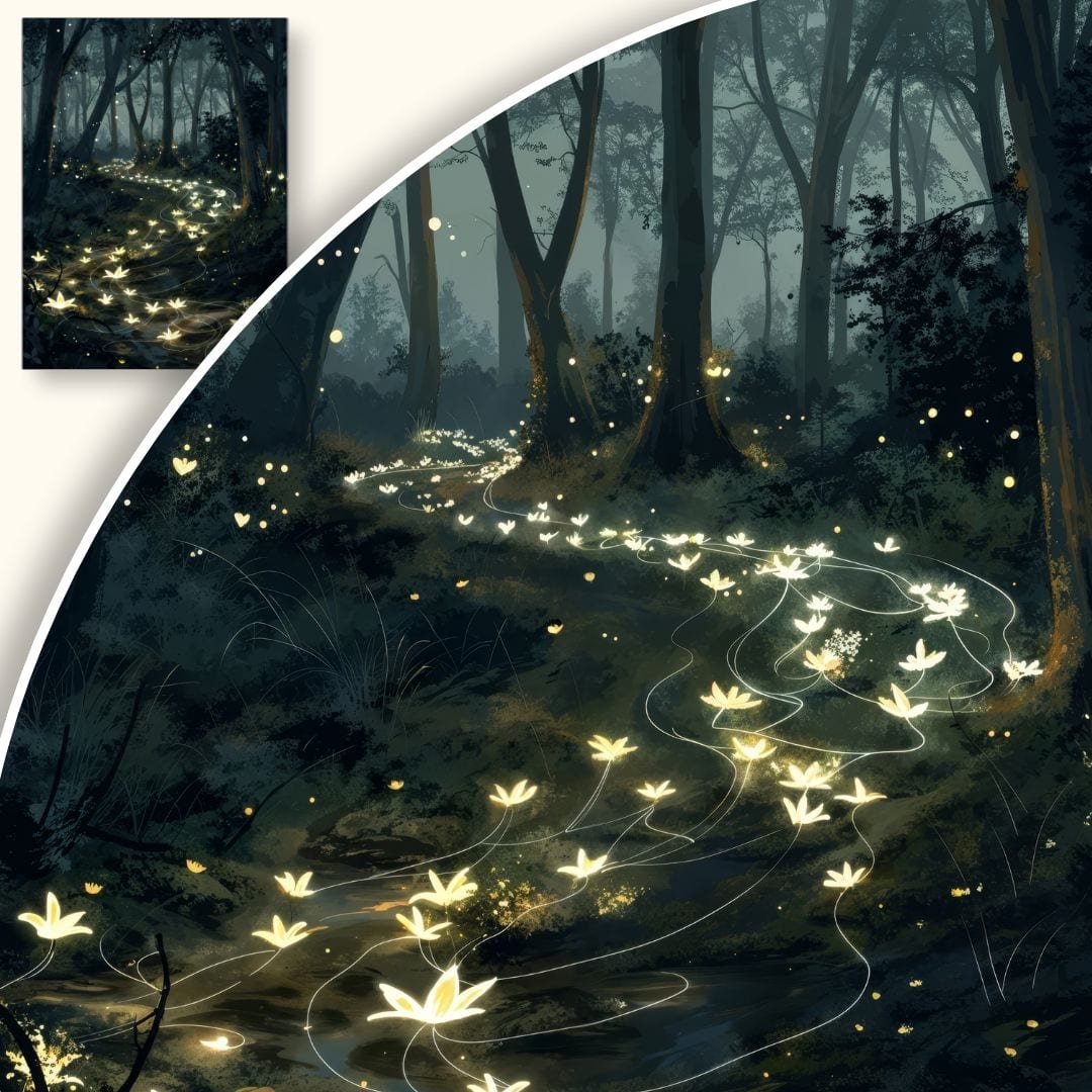 Kompozycja wizualnie prowadzi wzrok widza w głąb leśnej ścieżki otulonej drzewami. Przewagę stanowią ciemne odcienie zieleni i głębokiej czerni, które kontrastują z jasnym, żółtym światłem świetlików. Te subtelne akcenty świetlne ożywiają całość, tworząc wrażenie spokoju połączonego z nutą tajemnicy.
