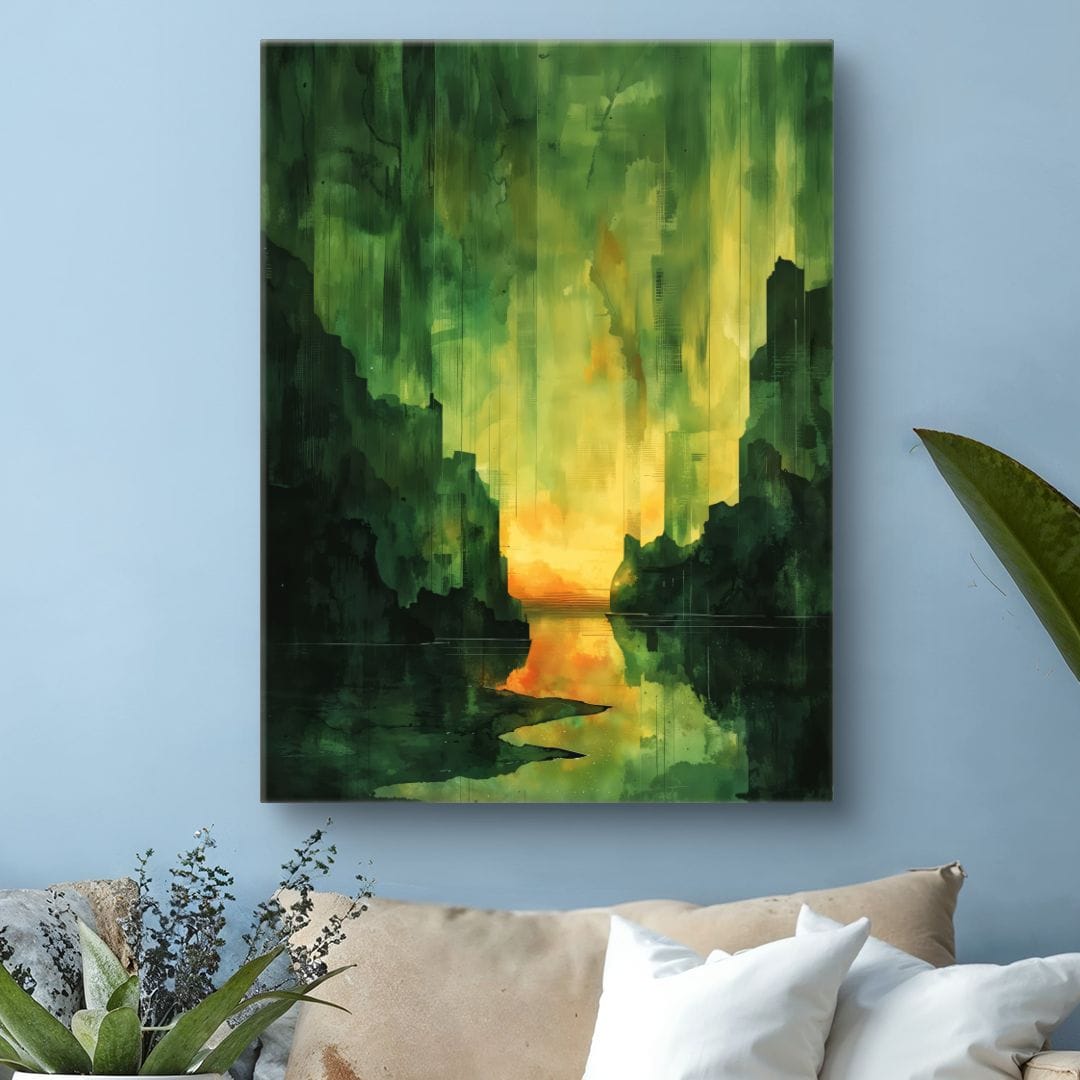 Kompozycja wyróżnia się dynamicznym układem, gdzie wzrok naturalnie podąża w stronę świetlistego centrum – słonecznego zachodu. Paleta barw, obejmująca zieleń, żółć i pomarańcz, wnosi świeżość i radość, natomiast odbicia światła w rzece potęgują poczucie przestrzeni.