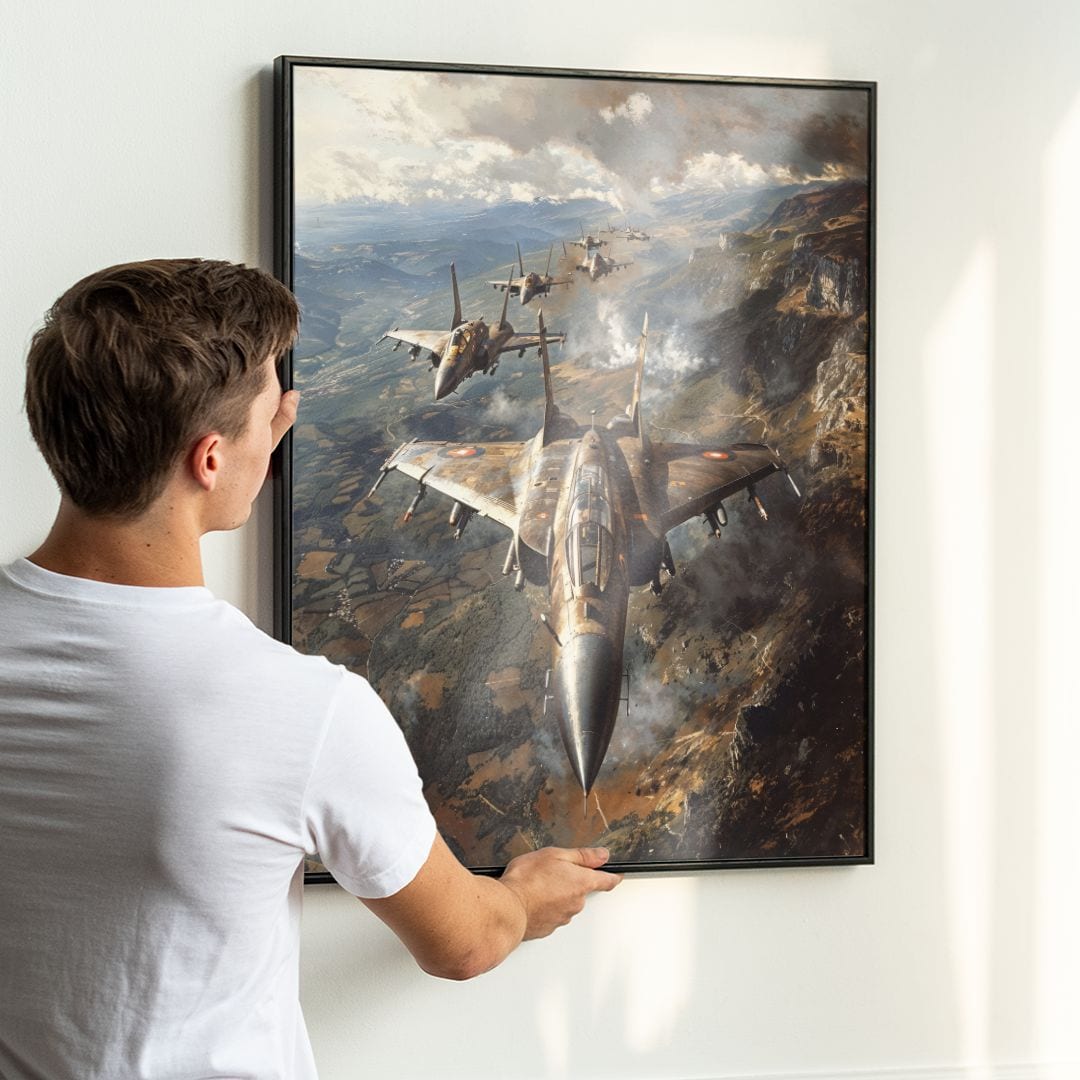 Plakat ukazuje dramatyczny lot formacji myśliwców unoszących się ponad malowniczym górskim pejzażem. Precyzyjna linia lotnicza i dynamiczny układ samolotów podkreślają zarówno majestat maszyn, jak i spójność grupy.