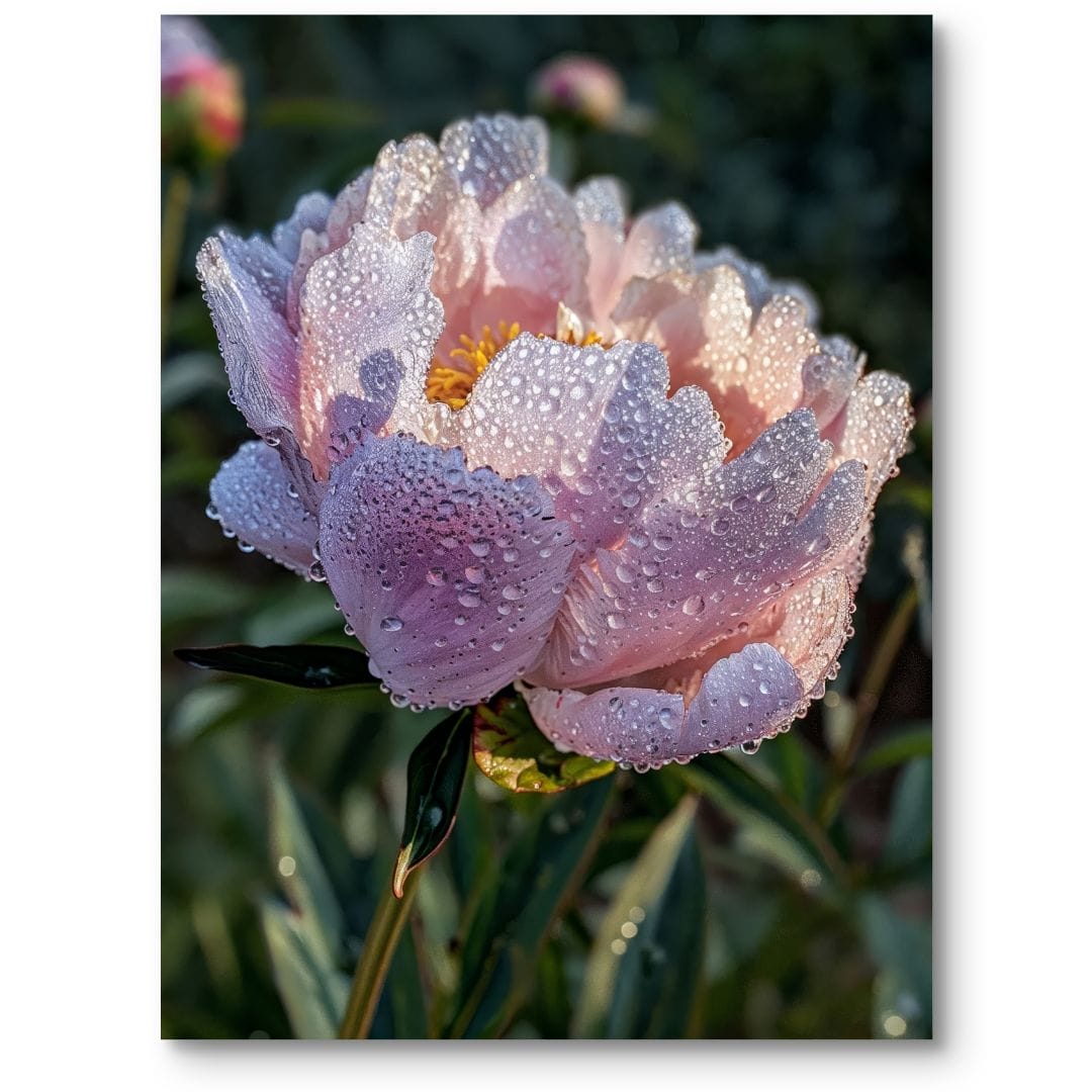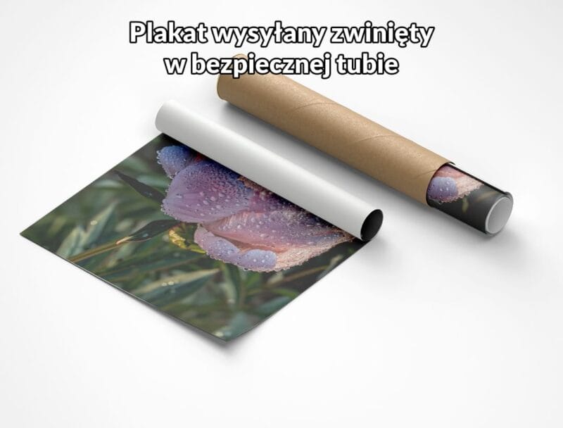 Ten plakat prezentuje zbliżenie na zachwycający kwiat piwonii przyozdobiony delikatnymi kroplami porannej rosy. Każdy detal – subtelne płatki, lśniąca woda i harmonijne odcienie różu oraz zieleni – został oddany z niezwykłą precyzją. Projekt odzwierciedla esencję naturalnego piękna, zachwycając subtelnością oraz elegancją tej wyjątkowej rośliny.