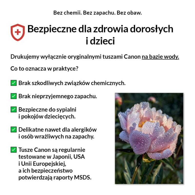 My drukujemy wyłącznie na pigmentowych tuszach Canon LUCIA PRO, bezpiecznych, bezzapachowych i certyfikowanych.
