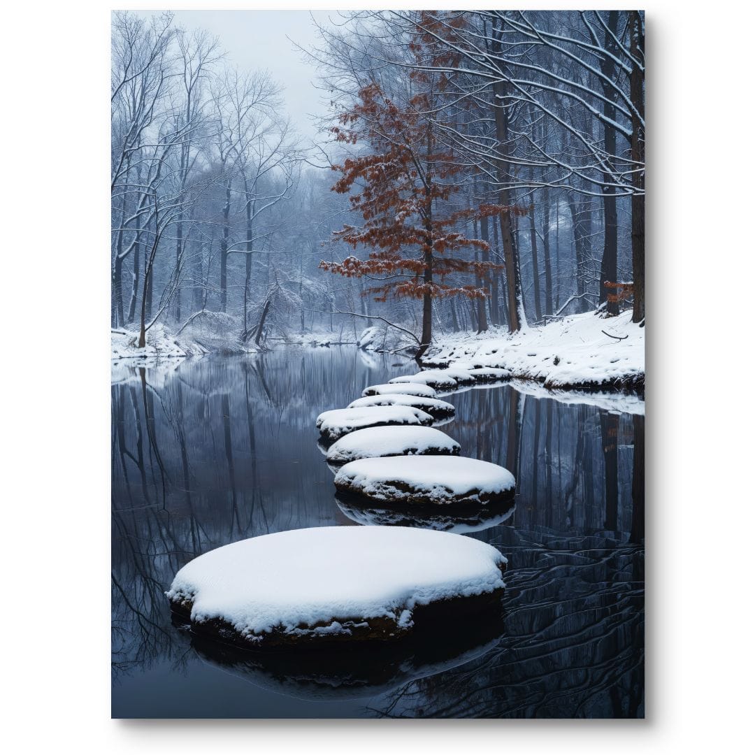 Ten plakat krajobrazowy zachwyca spokojem i harmonią. Przenosi odbiorcę w świat ciszy i ukojenia, gdzie śnieżna biel symbolizuje czystość oraz nowe początki. Kamienne ścieżki mogą stać się metaforą stabilności i przełamywania życiowych trudności.