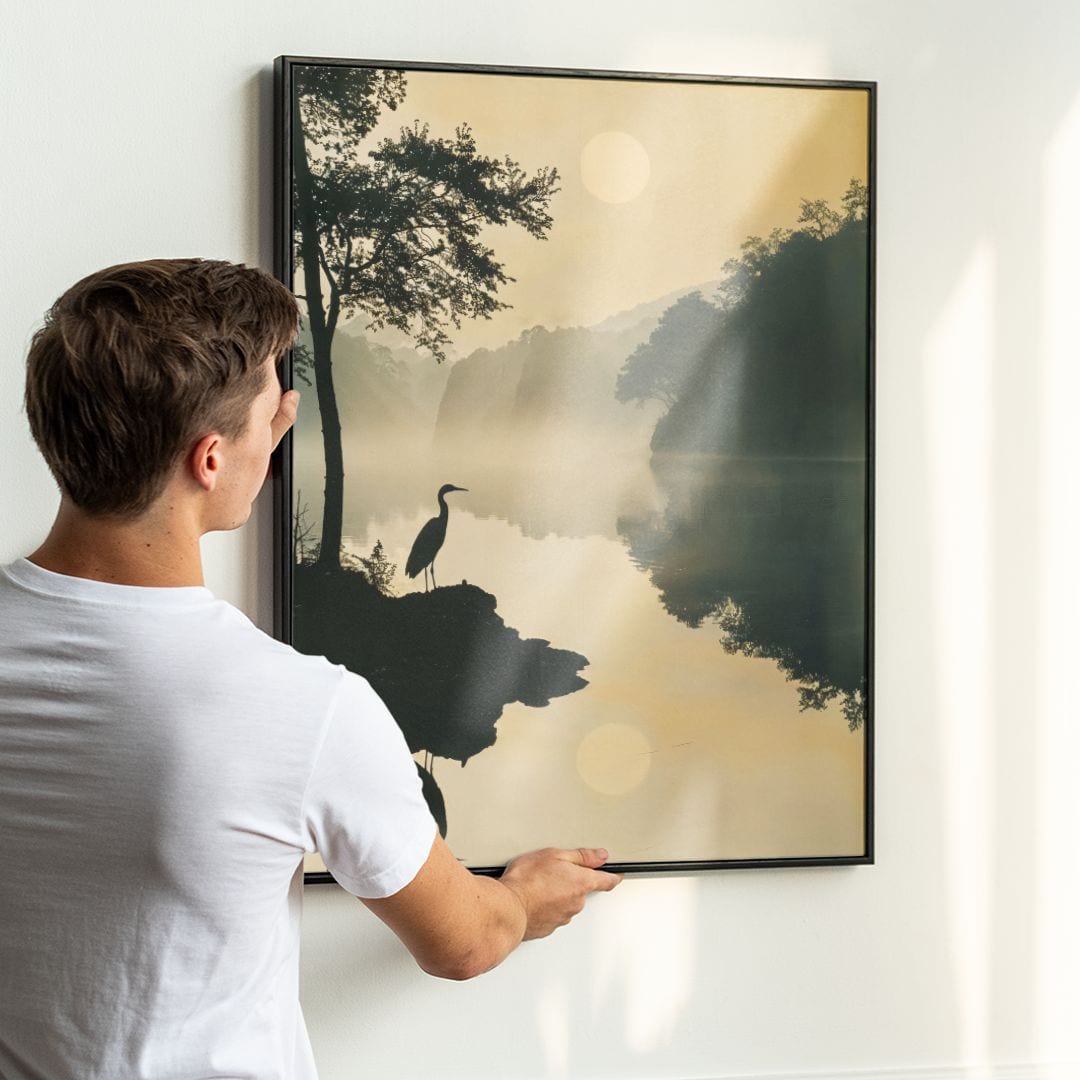 Plakat artystyczny przedstawia magiczny, spokojny poranek nad jeziorem, który rozświetla łagodne światło wschodzącego słońca. Na pierwszym planie dostrzec można smukłą sylwetkę czapli czuwającej na brzegu, jej odbicie subtelnie pojawia się na gładkiej tafli wody. W tle rozpościera się nastrojowy krajobraz – delikatne mgły unoszą się nad jeziorem, a zarys drzew oraz skał tworzy harmonijną oprawę dla tej naturalnej sceny.