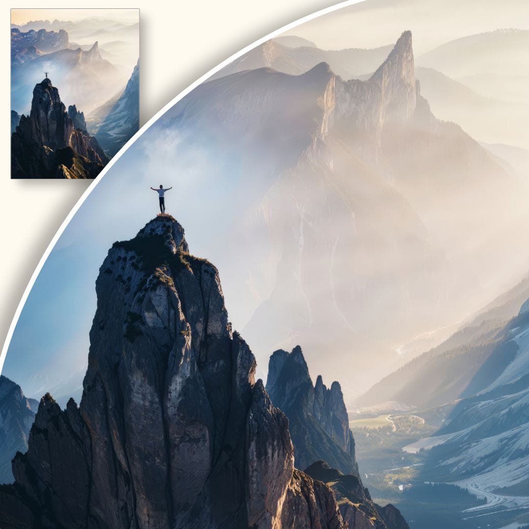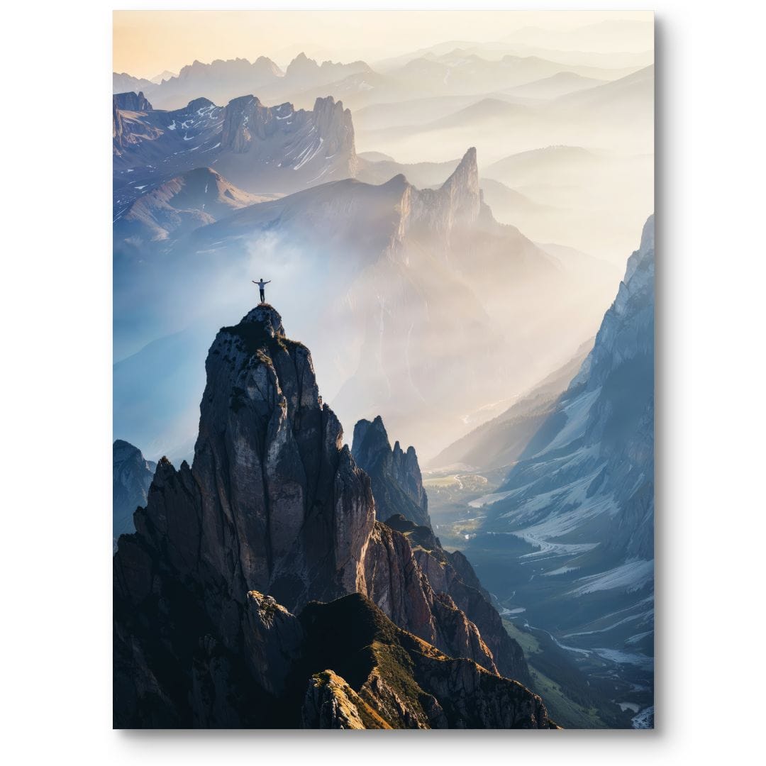 Prezentowany plakat ukazuje majestatyczny górski krajobraz, w którym wyróżnia się postać stojąca na szczycie skały, z rozpostartymi rękami uniesionymi ku niebu. To kompozycja idealna dla osób, które cenią potęgę natury, poczucie wolności oraz ducha przygody i eksploracji. Doskonale oddaje triumf i radość z pokonywania własnych granic, będąc inspiracją do działania i spełniania marzeń.