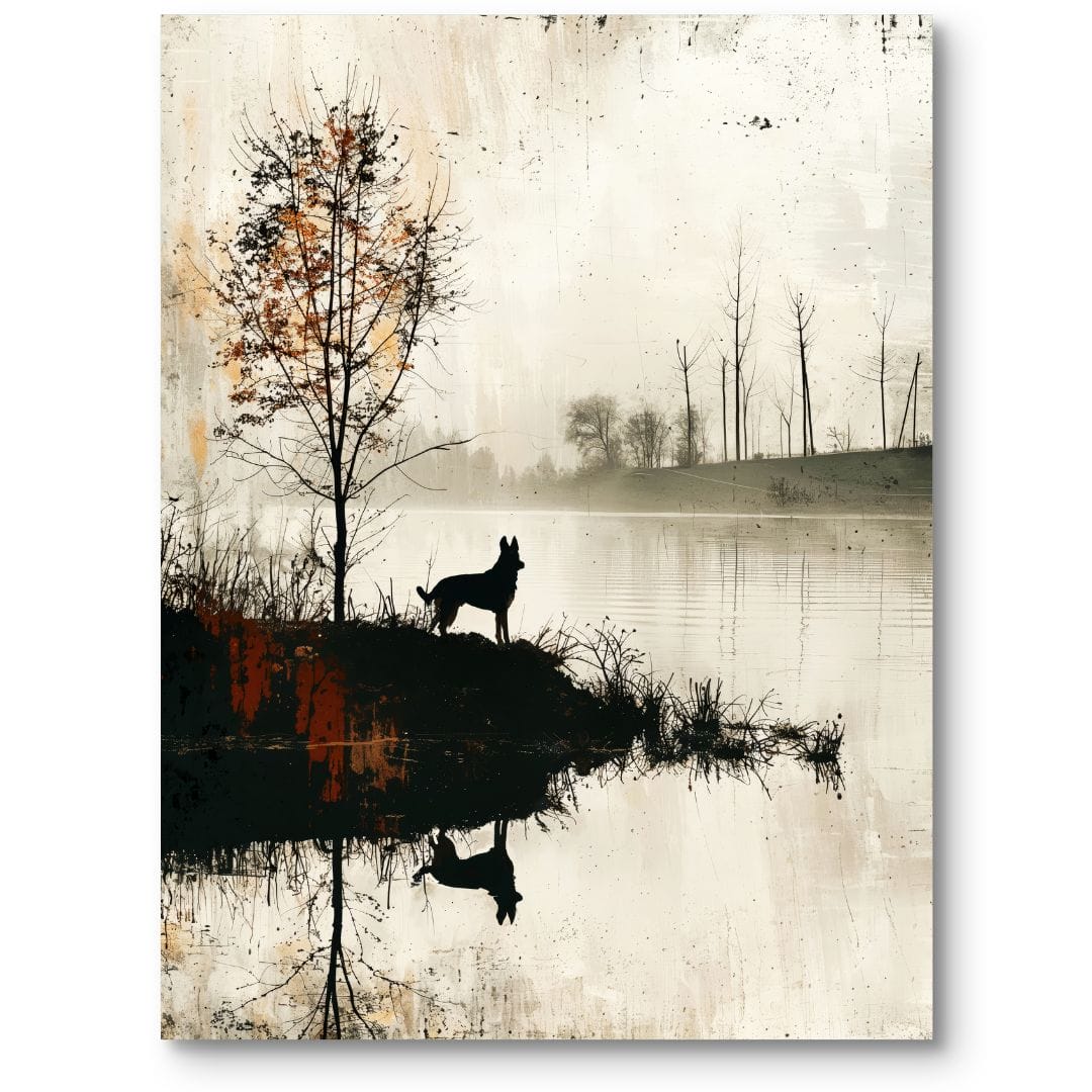 Kompozycja plakatu cechuje się idealną równowagą — pies przyciąga wzrok jako centralny bohater, natomiast drzewo i jego odbicie w wodzie wprowadzają elegancką symetrię. Paleta barw — czarno-biała z akcentami pomarańczu oraz brązu — podkreśla naturalność krajobrazu i subtelnie pogłębia perspektywę. Delikatne, miękkie światło buduje spokojny, kojący klimat, doskonały na każdą porę roku.