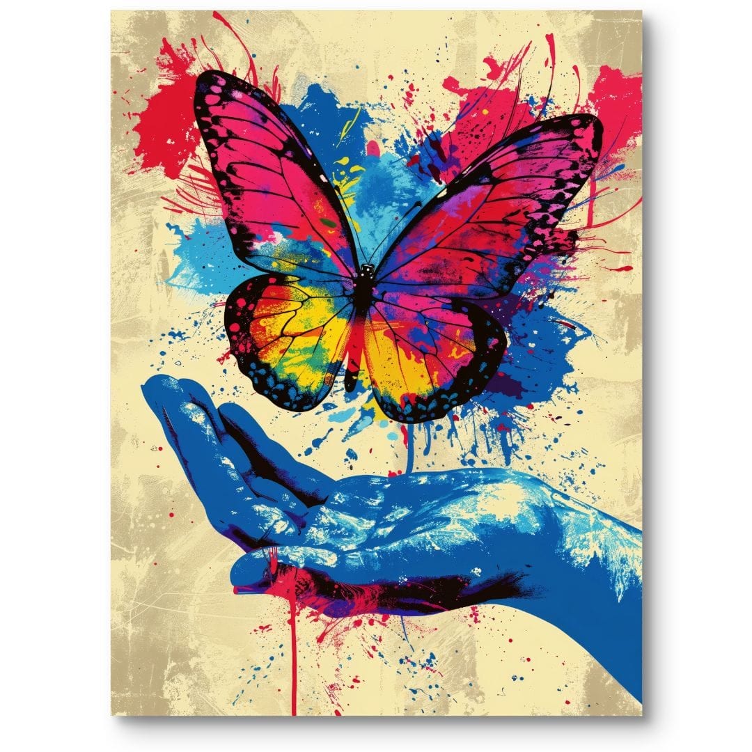 Odkryj wyjątkowy plakat przedstawiający motyla spoczywającego na delikatnych dłoniach, otoczony eksplozją energetycznych, kolorowych plam w tle. Motyl, będący uniwersalnym symbolem przemiany, wolności i piękna, został ukazany w intensywnych, kontrastujących barwach. To dzieło ożywia przestrzeń, tworząc poczucie ruchu i świeżości.