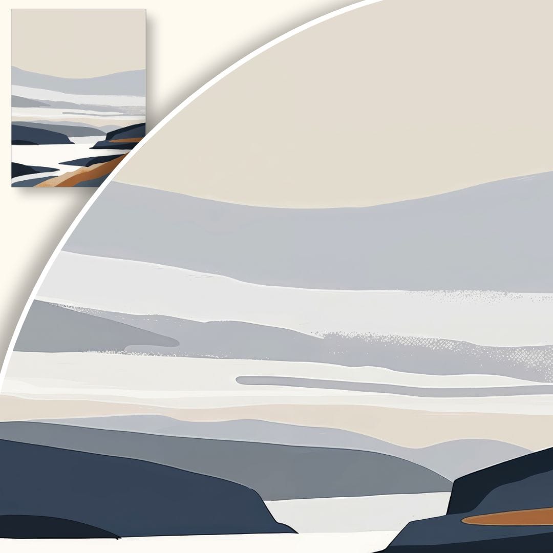 - Stwórz galerii ścienną, łącząc minimalistyczny krajobraz z innymi abstrakcyjnymi grafikami utrzymanymi w podobnej tonacji – zyskasz subtelny, nowoczesny efekt wizualny.