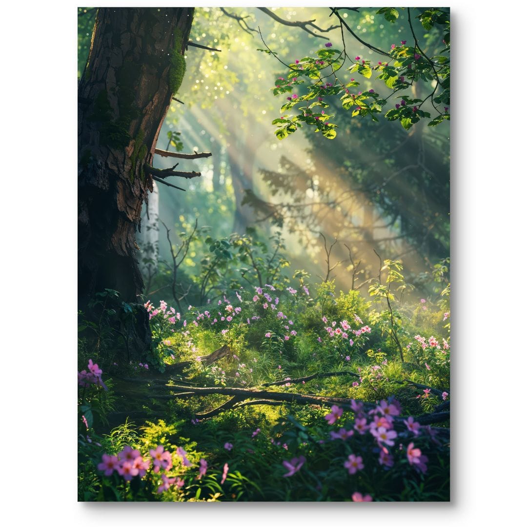 Plakat przedstawia urzekający leśny poranek, w którym złote promienie słońca subtelnie przebijają się przez gęste korony drzew. Czarująca leśna polana obsypana różowymi kwiatami tworzy harmonijny obraz dziewiczej przyrody. Kompozycja wyraźnie podkreśla niezwykłe piękno, równowagę i spokój nieskażonego, naturalnego krajobrazu.