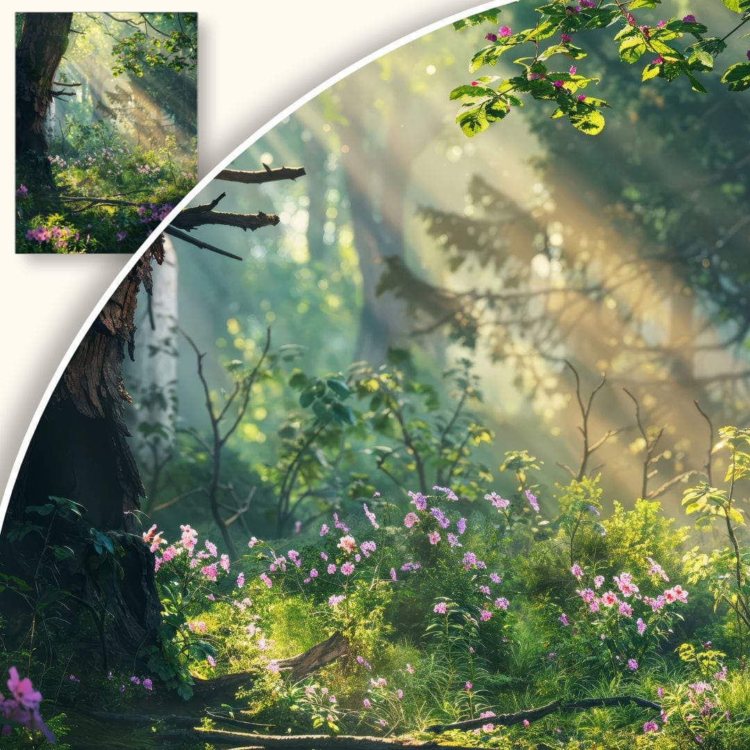 Centralny punkt plakatu stanowi słoneczna leśna polana, szczodrze obdarzona żywymi, zielonymi odcieniami oraz ciepłymi brązami pni drzew. Różowe kwiaty wprowadzają kontrast kolorystyczny, przyciągając wzrok i ożywiając scenę. Subtelne światło rozlewające się z góry tworzy efekt głębi, czyniąc plakat trójwymiarowym i zmysłowym.