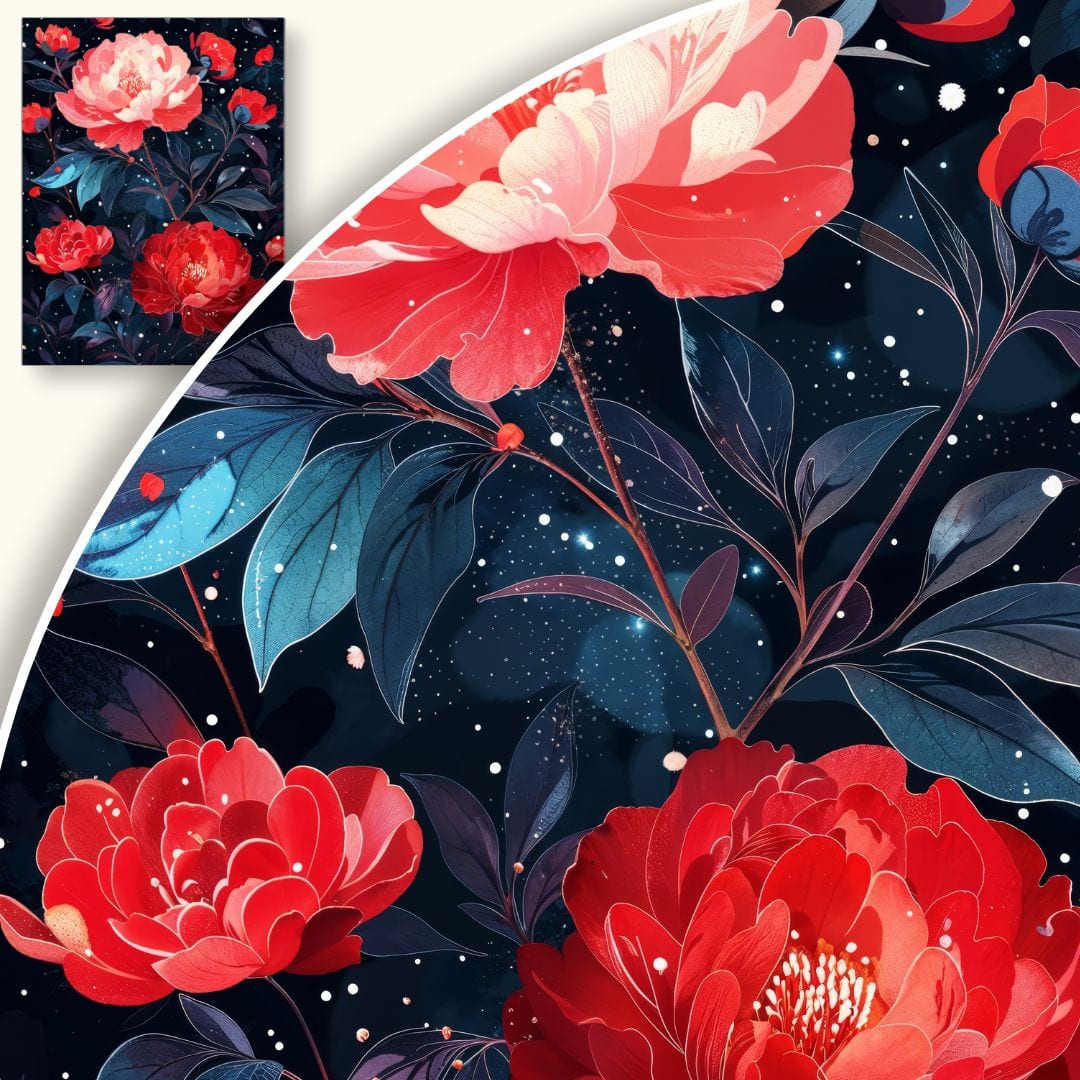 Piwonie od wieków były symbolem dobrobytu, szczęścia i dostojności, często pojawiając się w chińskiej oraz japońskiej sztuce, literaturze i dekoracjach pałacowych. Nocne niebo, zestawione z kwiatami, nawiązuje do tradycyjnych motywów romantycznych, gdzie natura i kosmos splatają się w jedną poetycką całość – podobne wątki odnaleźć można m.in. w obrazach Vincenta van Gogha czy ilustracjach Alphonse’a Muchy.