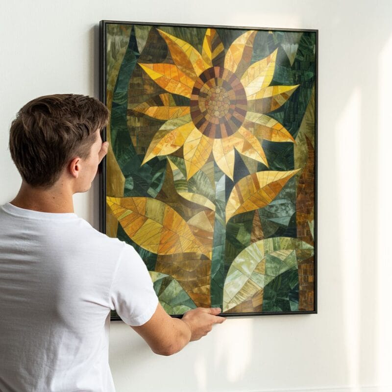 - Postaw na galeriową ścianę, łącząc słonecznik z innymi botanicznymi motywami lub plakatami w stylu boho.