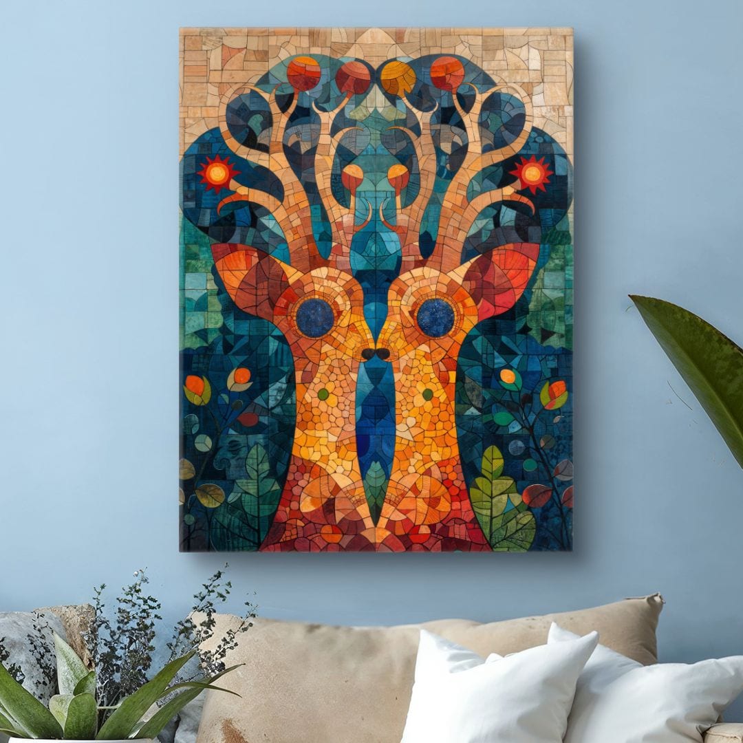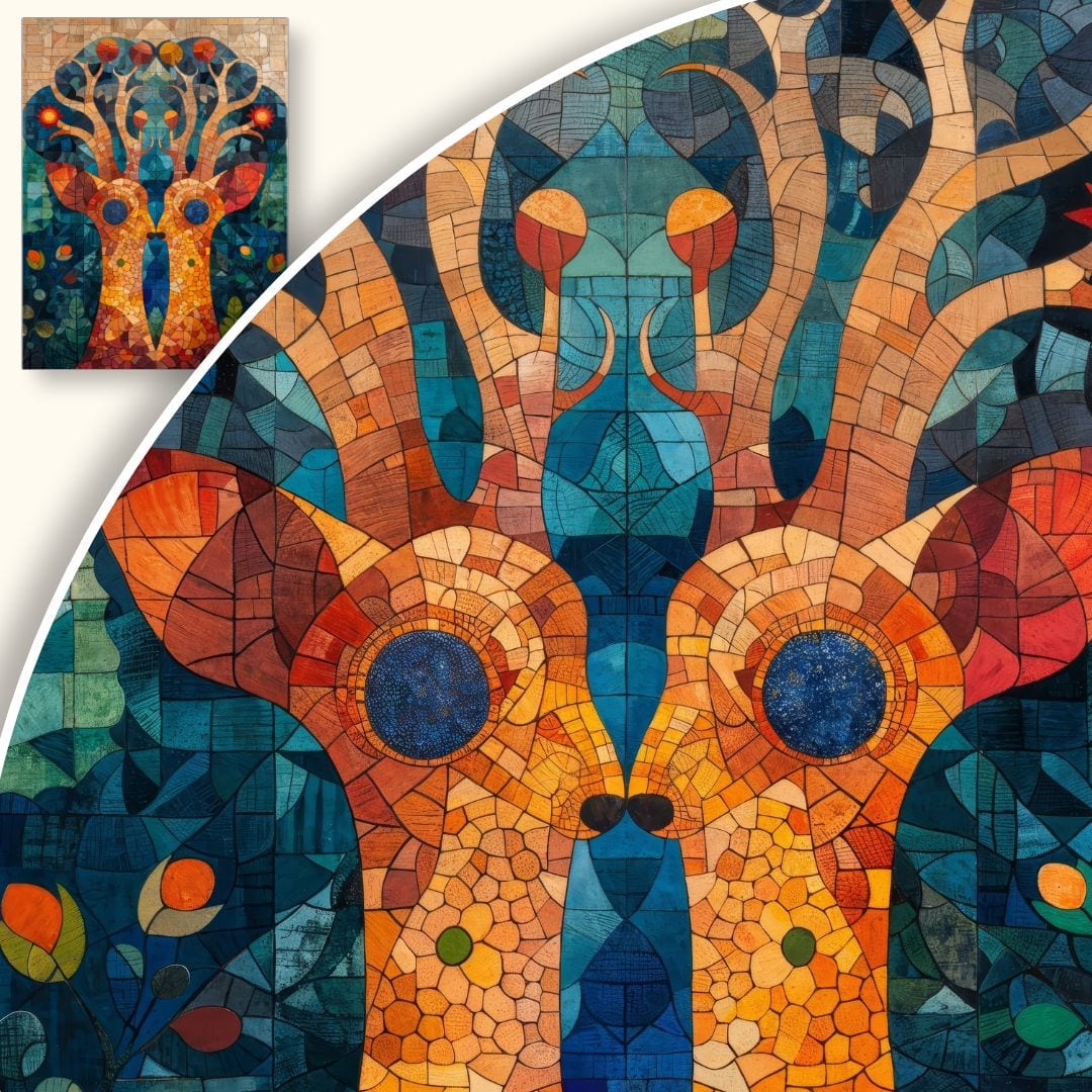 Plakat przedstawia abstrakcyjne, stylizowane wyobrażenie jelenia, otoczonego bogactwem form roślinnych. Zestawienie motywu zwierzęcia z elementami natury tworzy fascynującą, barwną kompozycję, która przyciąga uwagę nieoczywistym połączeniem kształtów i kolorów.