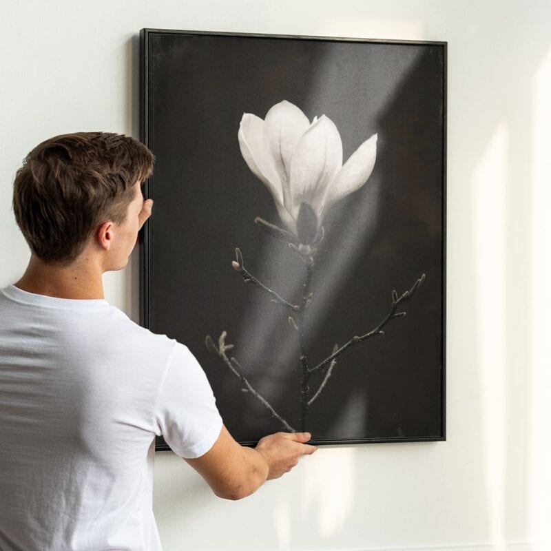 Minimalistyczna fotografia makro wywodzi się z tradycji sztuki modernistycznej oraz nowoczesnej fotografii botanicznej. Inspiracją dla tego typu dzieł byli tacy artyści jak Karl Blossfeldt, znany ze swoich czarno-białych zdjęć roślin, oraz Imogen Cunningham, która poetycko ukazywała kwiaty w zbliżeniach. Plakat z magnolią nawiązuje do tej estetyki, przenosząc naturalną prostotę w sferę sztuki użytkowej.