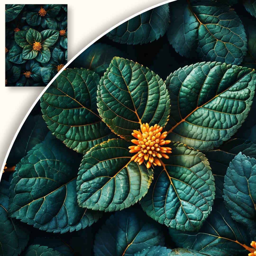 Plakat przedstawia fascynujące zbliżenie na egzotyczną roślinę otuloną bogactwem zielonych liści. W centrum uwagi znajduje się intensywnie pomarańczowy kwiat, którego ciepły odcień tworzy energetyzujący kontrast z soczystą zielenią tła, przyciągając wzrok i zachwycając detalami.
