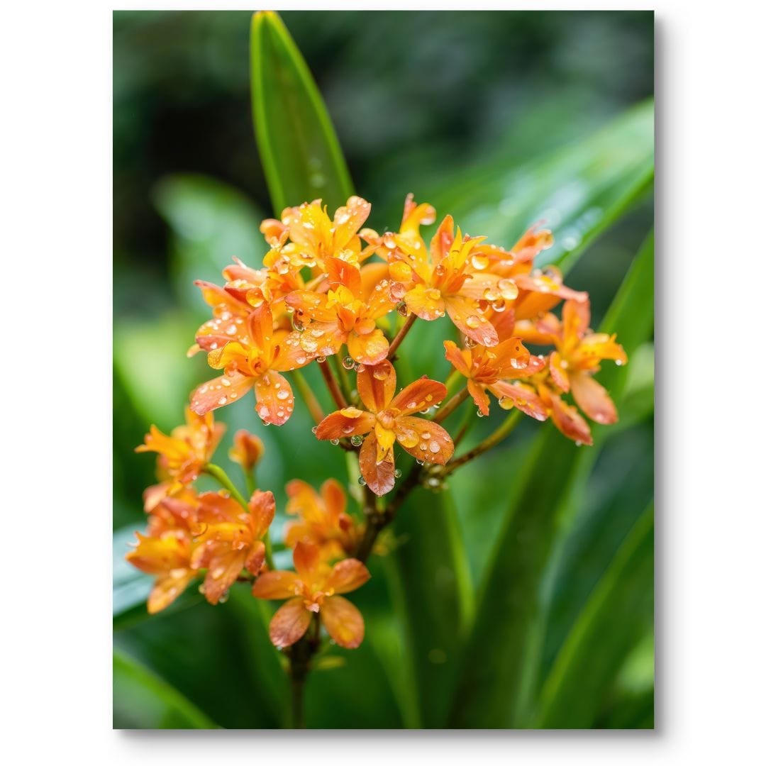 Ten wyjątkowy plakat ukazuje zjawiskową makrofotografię intensywnie pomarańczowych kwiatów skąpanych w delikatnych kroplach rosy. Przedstawienie subtelnej natury w takiej odsłonie niesie ze sobą uczucie świeżości, spokoju oraz wyjątkowej harmonii, wprowadzając niepowtarzalny klimat do każdego pomieszczenia.