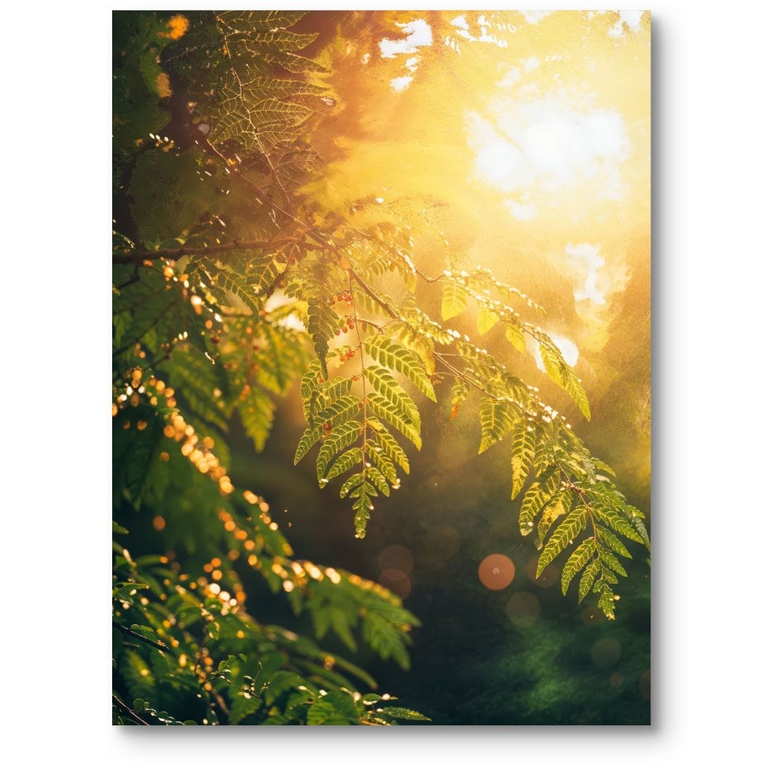 Plakat charakteryzuje się wyjątkową, harmonijną kompozycją z wyraźnym, centralnym źródłem światła, które podkreśla soczyście zielone liście. Dominują ciepłe, naturalne barwy: zielenie, złota żółć oraz delikatny pomarańcz, które wspólnie budują pogodny i odprężający nastrój.