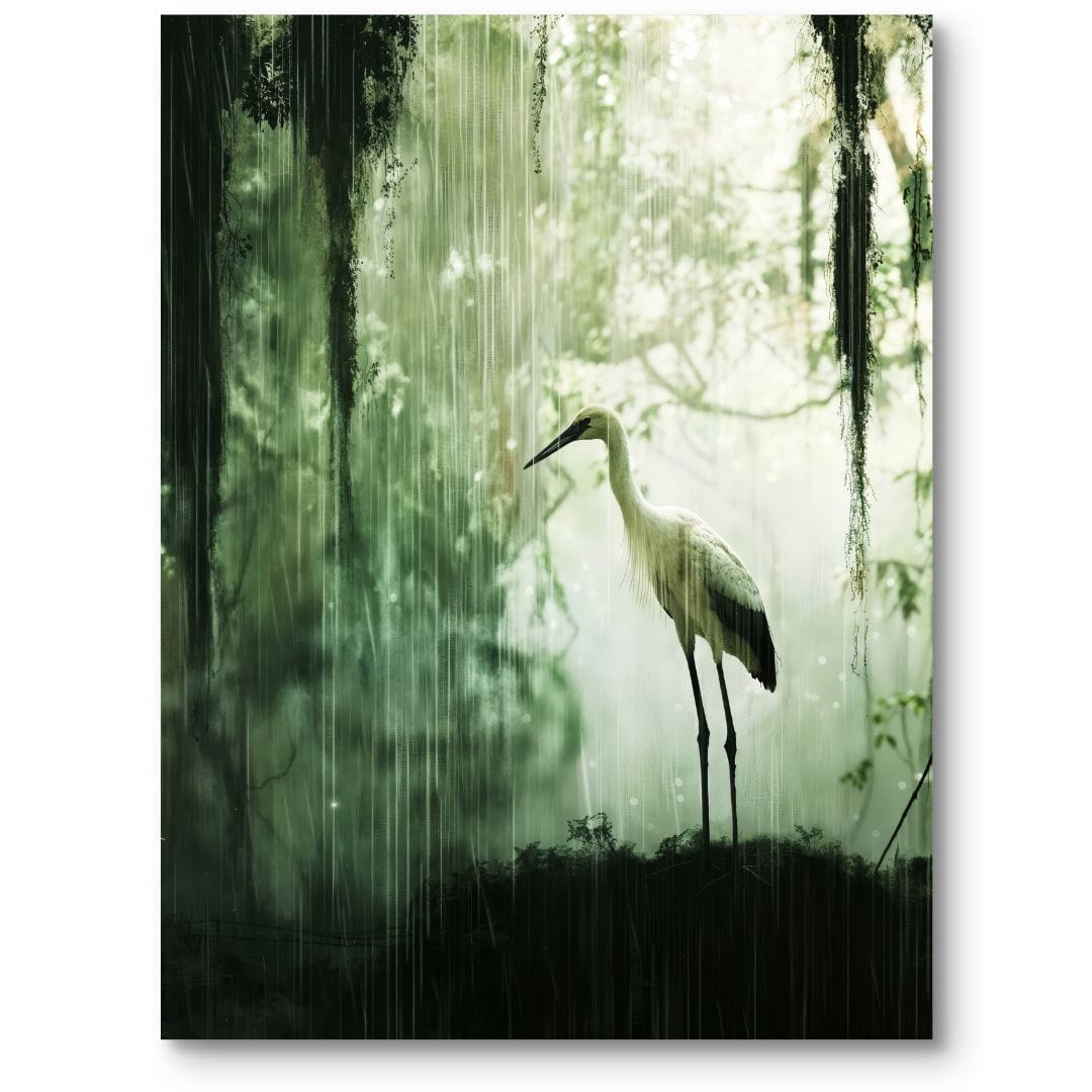 Plakat ukazuje dostojną czaplę, zatopioną w ciszy zielonego, deszczowego lasu. Jej smukła sylwetka i śnieżnobiałe pióra wybijają się na tle gęstej, bujnej roślinności, tworząc obraz pełen naturalnej elegancji i łagodności. Całość oddaje niepowtarzalny urok dzikiej przyrody, podkreślając jej harmonię oraz subtelny, mistyczny nastrój.
