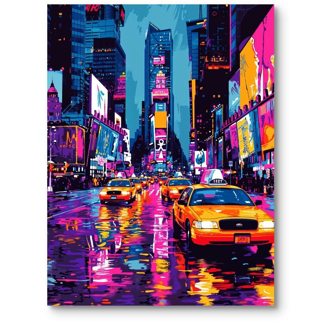 Plakat prezentuje niezwykle dynamiczną scenę miejskiego życia w samym sercu Nowego Jorku – na słynnym Times Square. Na pierwszym planie wyróżniają się charakterystyczne żółte taksówki, które mkną po mokrej ulicy, odbijając feerię barw rozświetlonych neonów i reklam. W tle królują monumentalne budynki i barwne billboardy, tworząc razem intensywny, tętniący energią krajobraz współczesnej metropolii.