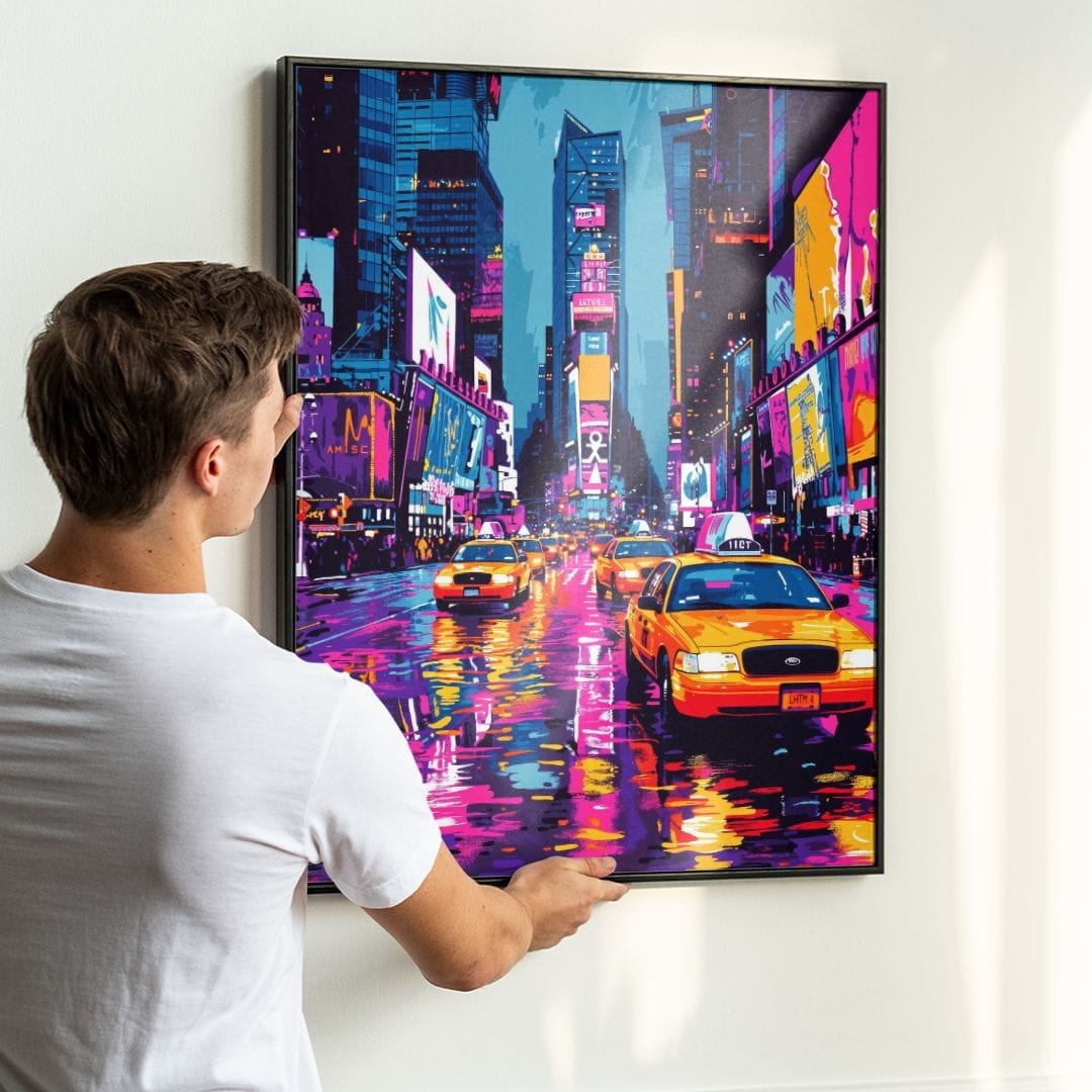 Pop-art, który dominuje na plakacie, narodził się w latach 50. i 60. XX wieku jako odpowiedź na masową kulturę i błyskawicznie zdobył uznanie na całym świecie. Ikony tego nurtu, jak Andy Warhol czy Roy Lichtenstein, często wykorzystywały motywy miejskie i elementy popkultury, zamieniając codzienność w sztukę. Plakat z Times Square nawiązuje do tej tradycji, ukazując magiczną stronę zwykłych scen życia miasta poprzez soczystą kolorystykę i śmiałe kontrasty.