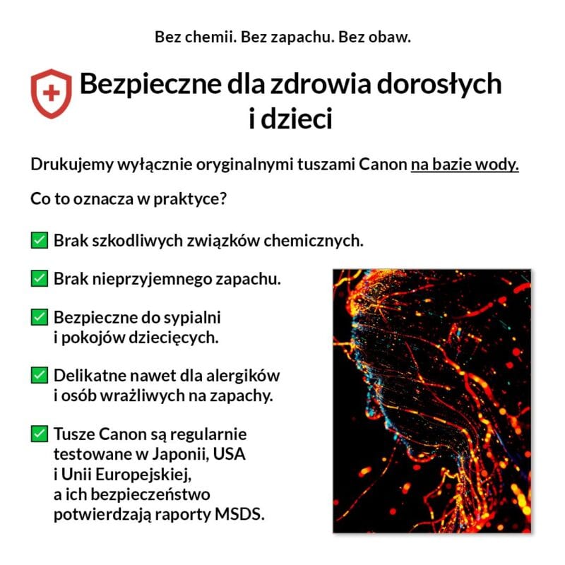 My drukujemy wyłącznie na pigmentowych tuszach Canon LUCIA PRO, bezpiecznych, bezzapachowych i certyfikowanych.