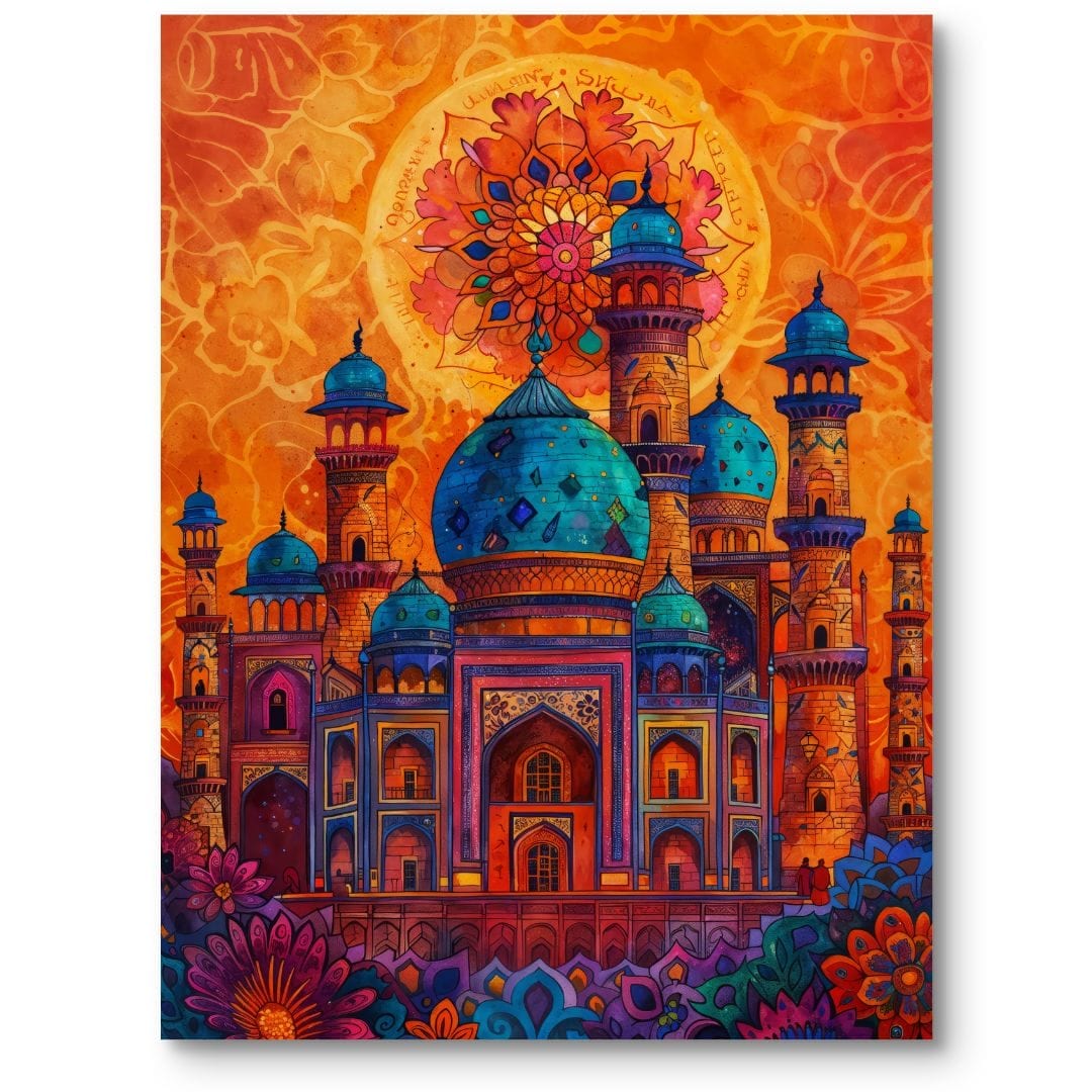 Plakat ukazuje fantastyczną wizję orientalnej architektury, wypełnioną bogactwem kolorów oraz misternie zaprojektowanymi detalami. Inspirowany kulturą Dalekiego i Bliskiego Wschodu, przywołuje na myśl majestatyczne budowle Indii i krajów orientalnych, wprowadzając do wnętrza magię egzotycznych podróży.