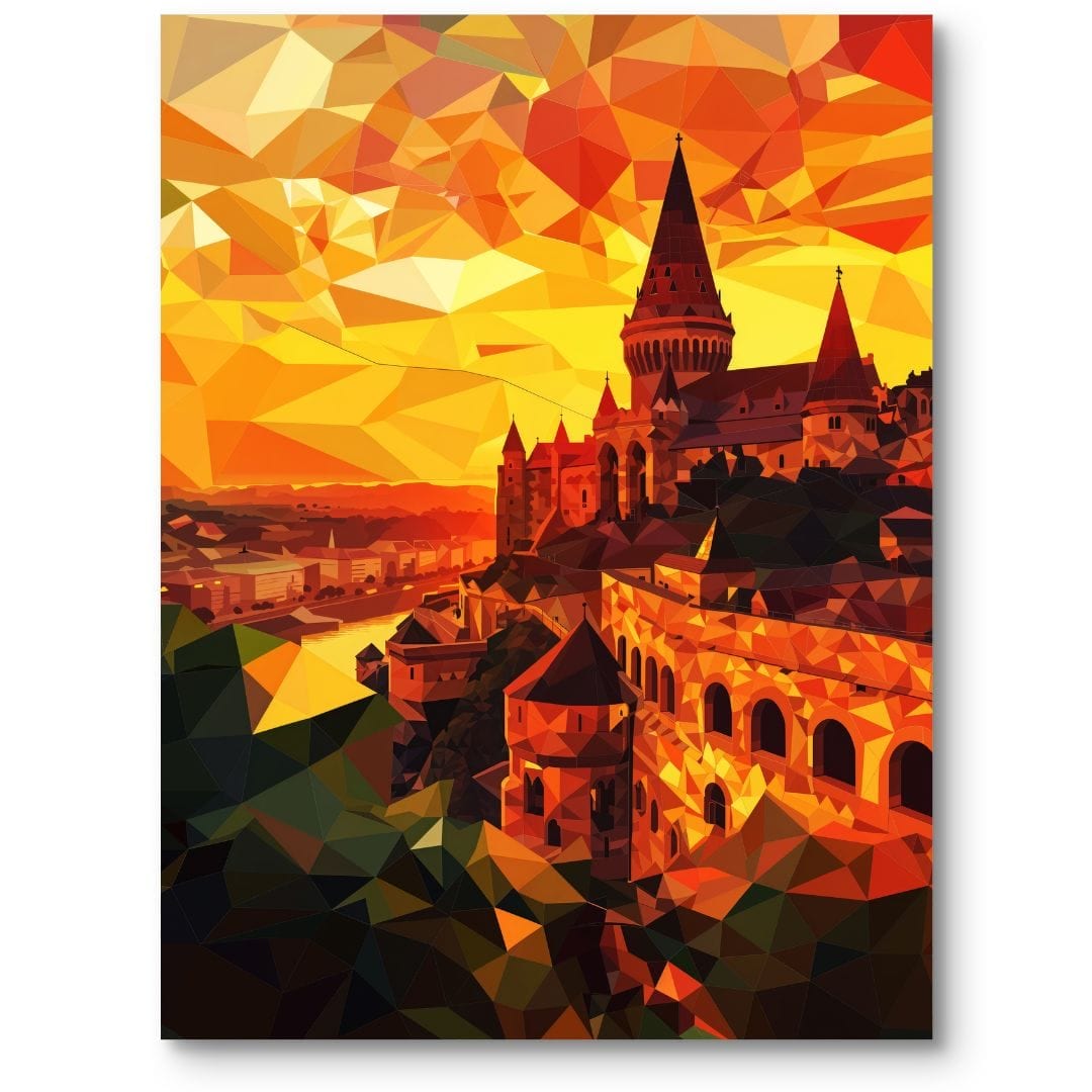 Plakat ukazuje zachwycający widok na słynną Basztę Rybacką – perłę architektury Budapesztu i symbol węgierskiego dziedzictwa. Zachód słońca maluje niebo intensywnymi, ciepłymi barwami, zanurzając miasto w aurze magii i wyjątkowego spokoju.