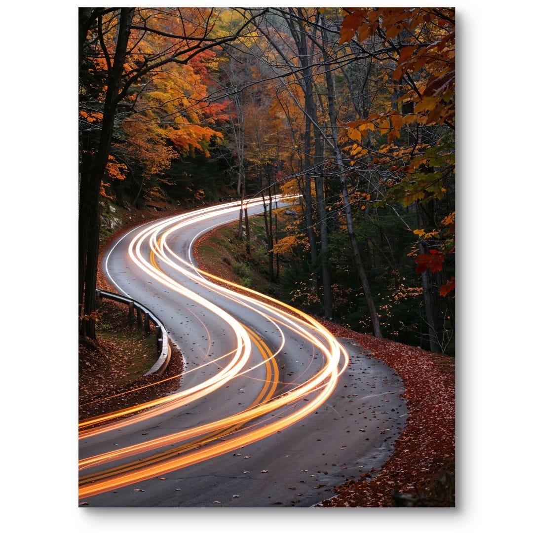 Kompozycja obrazu prowadzi wzrok w głąb lasu, podążając za zakrętem drogi, co buduje wrażenie ruchu i głębi. Linearne światła kontrastują z miękkimi, naturalnymi barwami liści, a harmonia pomarańczowych, żółtych i zielonych tonów tworzy jednocześnie energiczny, ale przytulny klimat.