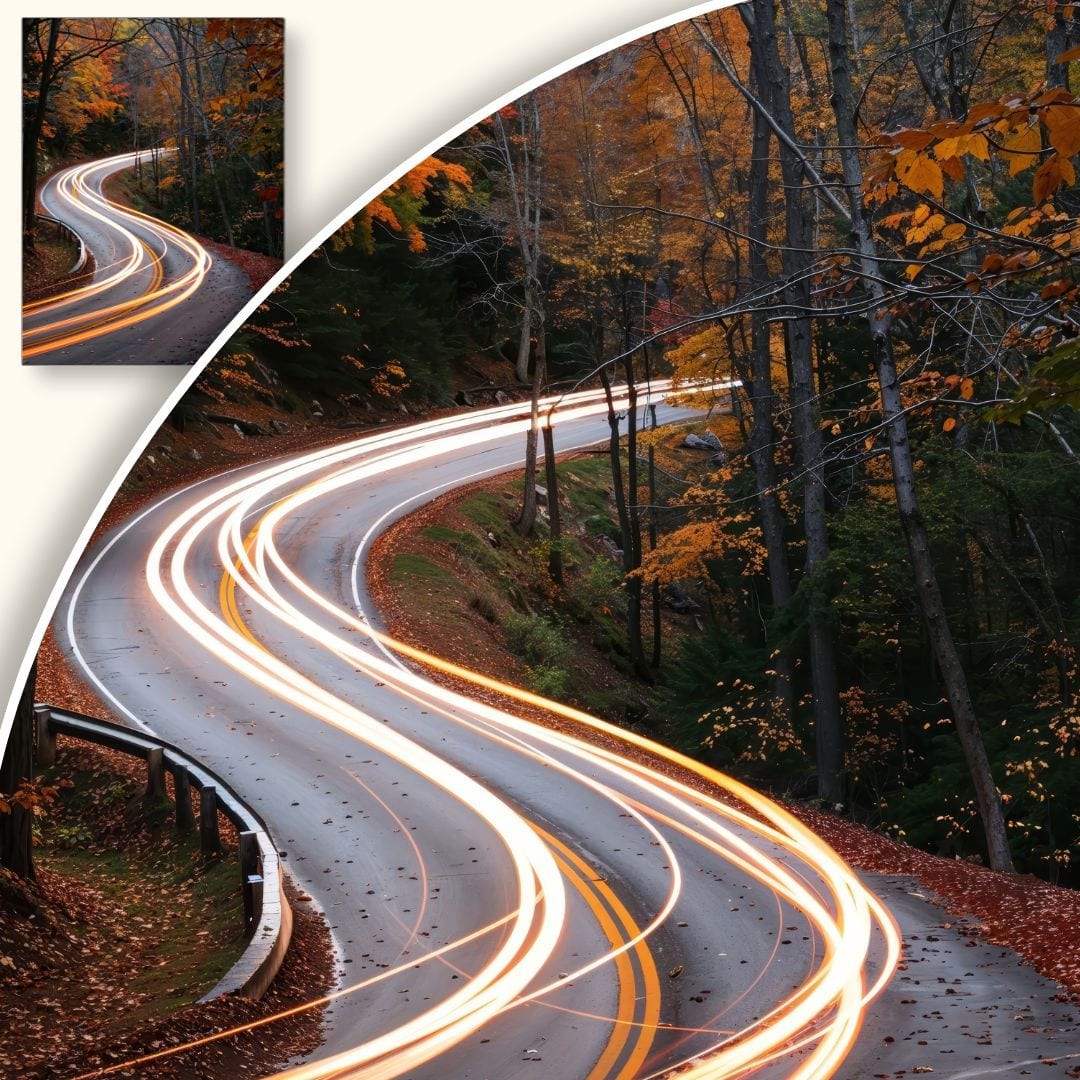 - Malownicza droga w jesiennym lesie z dynamicznymi smugami światła.