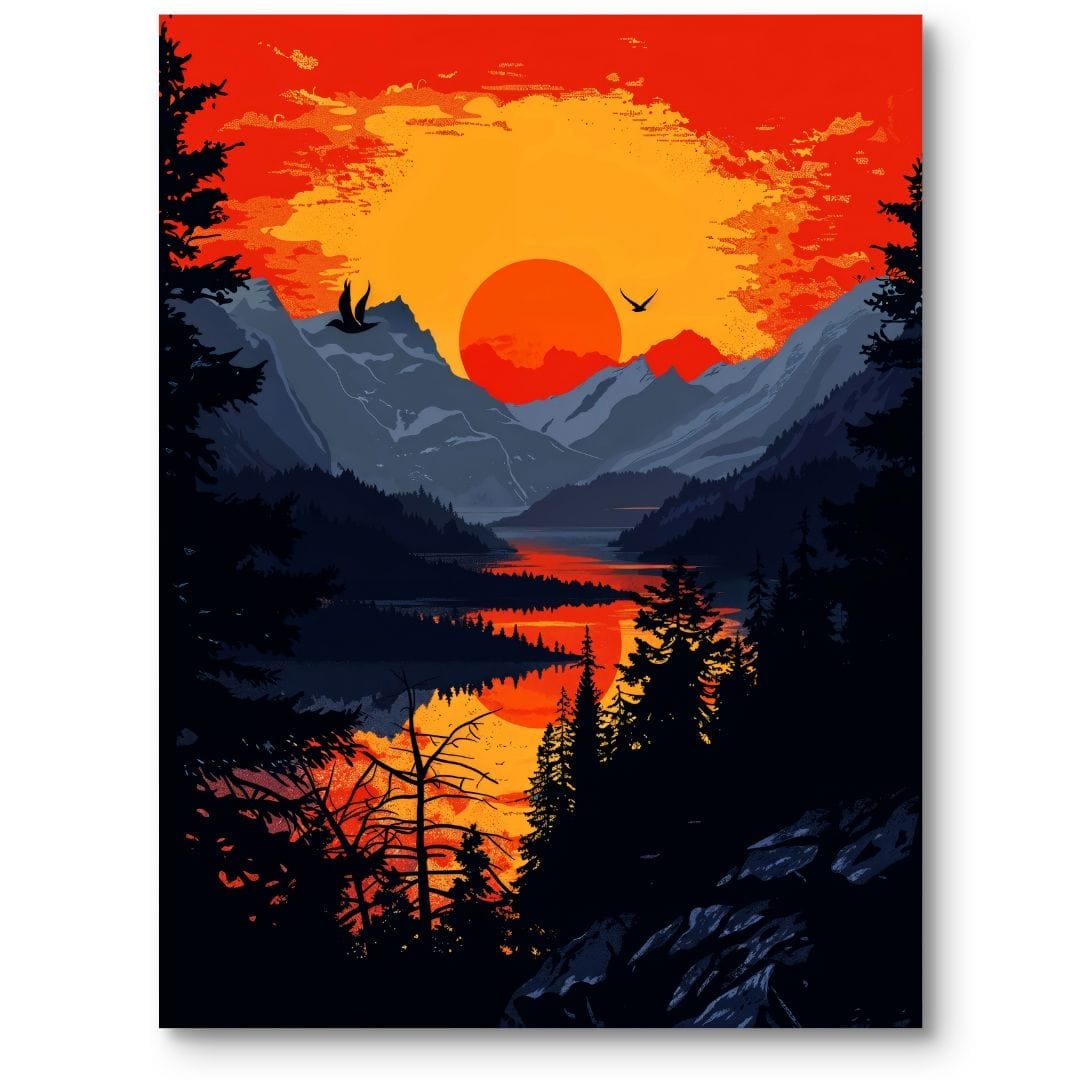 Ten plakat przenosi widza w zachwycający świat górskiego jeziora skąpanego w intensywnych barwach zachodu słońca. Malownicza panorama, otoczona majestatycznymi szczytami i subtelnie rozproszonym światłem, tworzy niezwykle ekspresyjny i zapadający w pamięć widok. To zaproszenie do kontemplacji piękna natury w najpiękniejszym wydaniu.