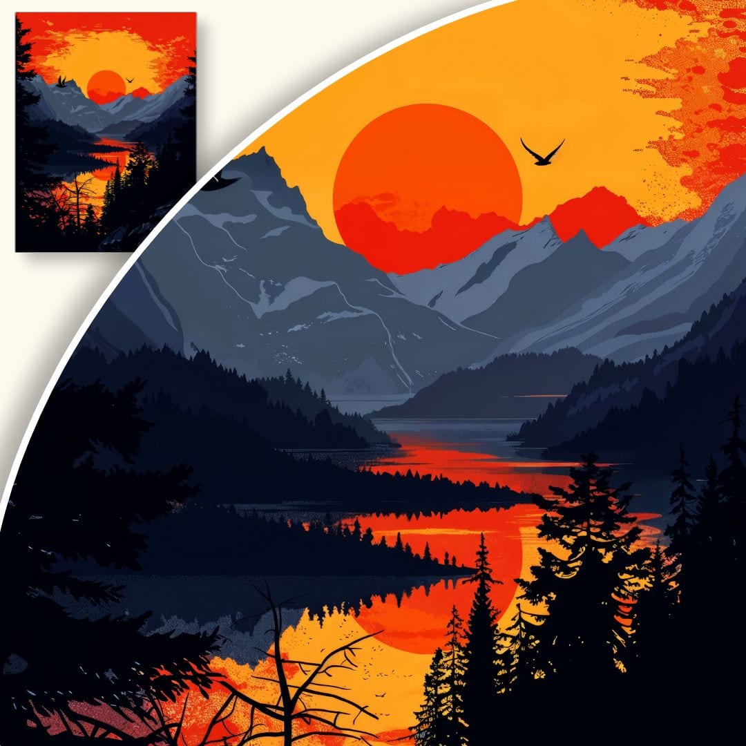 Motyw górskich jezior i pejzaży o zachodzie słońca to klasyka sztuki krajobrazowej. Artyści tacy jak Albert Bierstadt czy Caspar David Friedrich chętnie sięgali po monumentalne sceny natury, interpretując je przez pryzmat światła i nastroju. Nasz plakat odnosi się do tej tradycji, przenosząc ją we współczesny, cyfrowy wymiar.