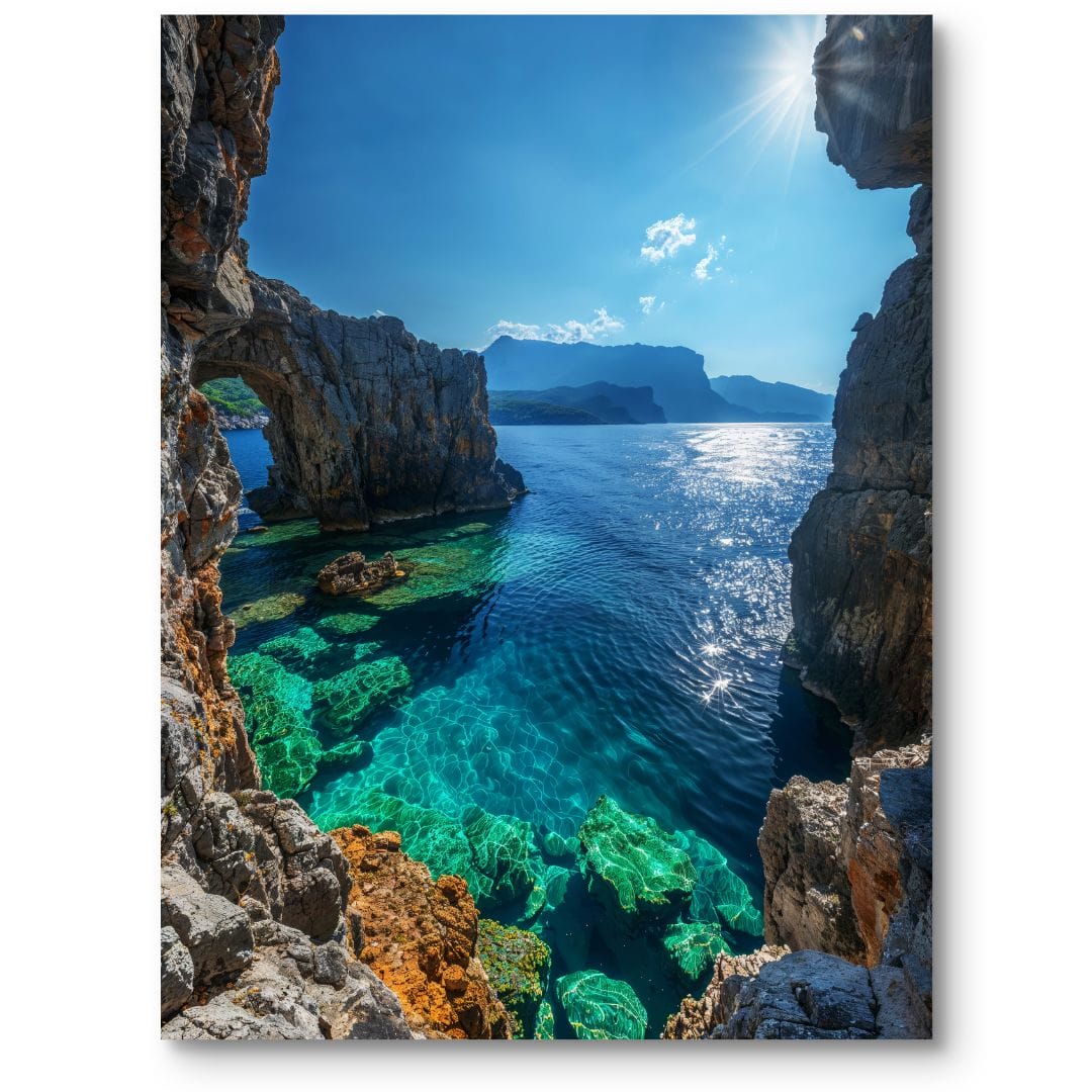 Ten plakat zachwyca malowniczym nadmorskim pejzażem – krystalicznie czysta woda, efektowne skały oraz słoneczne, bezchmurne niebo tworzą harmonijną całość. Centralnym punktem kompozycji jest skalisty łuk, przez który przeświecają turkusowe odcienie wody. W tle rozpościera się spokojne, błękitne morze połączone horyzontem z niebem, a gra świateł i bogactwo detali oddają niezwykłe piękno przyrody.