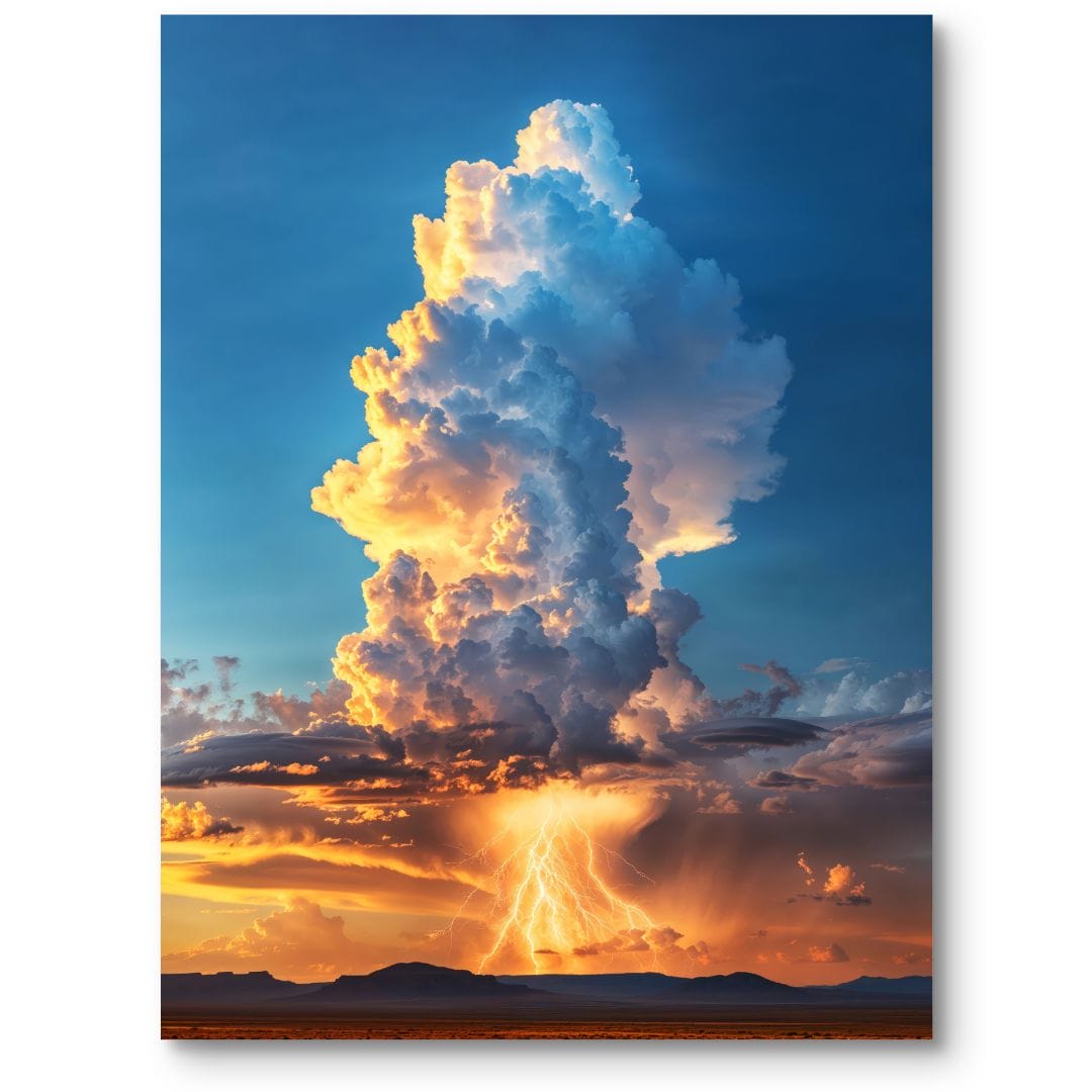 Ten efektowny plakat ukazuje imponującą scenę burzy – roziskrzony piorun przecina niebo pod monumentalną kłębą chmur. Intensywne odcienie pomarańczowego i niebieskiego przeplatają się z bielą chmur, tworząc kontrastową, spektakularną kompozycję. Plakat nie tylko zachwyca estetyką, ale też wprowadza do wnętrza niezwykły klimat żywiołu i nieprzewidywalności natury.
