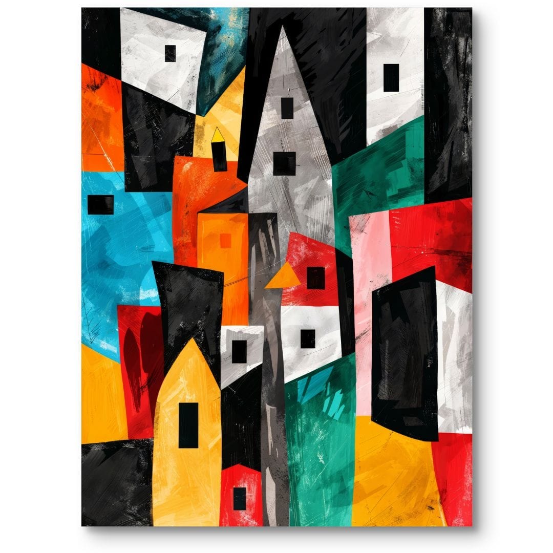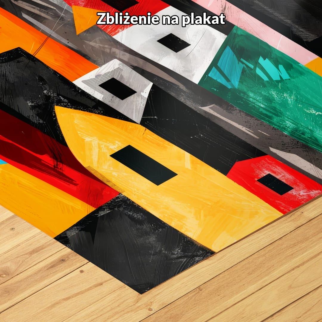 Prezentowany plakat ukazuje abstrakcyjną kompozycję pełną geometrycznych form, które przywodzą na myśl architektoniczne konstrukcje i nowoczesne budynki. Żywa i wyrazista kolorystyka – z dominacją czerni, czerwieni oraz niebieskiego – dodaje kompozycji energii i wizualnego dynamizmu, czyniąc ją niepowtarzalnym akcentem każdej przestrzeni.