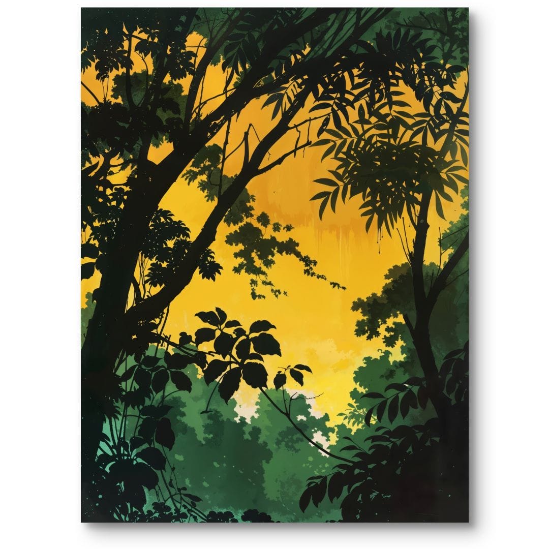 Plakat ukazuje magiczny las o zmierzchu, zanurzony w ciepłych promieniach zachodzącego słońca, które subtelnie przebijają się przez gęstwinę liści. Nasycone zielenie przeplatają się z energetycznymi odcieniami żółci, nadając całej kompozycji wyjątkowy, niemal baśniowy nastrój oraz nieoczywistą głębię. Dzięki temu las zyskuje aurę tajemniczości, która intryguje i zachwyca każdego obserwatora.