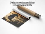 Ten wyjątkowy plakat ukazuje majestatycznego niedźwiedzia brodzącego w płytkiej wodzie rzeki, w świetle zachodzącego słońca. Sylwetka zwierzęcia zachwyca wyrazistością, a ciepłe, złote promienie podkreślają każdy detal, tworząc niezwykły kontrast z głębokimi, ciemnymi tonami tła. Kompozycja oddaje hołd dzikości natury i urodzie wieczornych pejzaży.