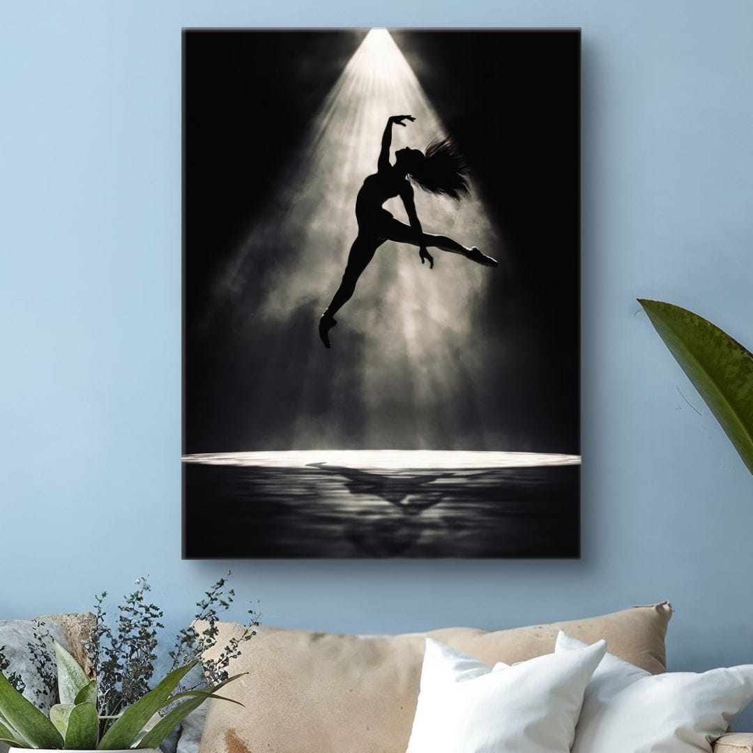 Ten wyjątkowy plakat na ścianę prezentuje pełną ekspresji sylwetkę tancerki baletowej uchwyconą w dynamicznym skoku. Ostre, punktowe światło precyzyjnie podkreśla każdy szczegół jej ciała, akcentując mięśnie oraz subtelne gesty. Plakat celebruje nie tylko piękno, ale również siłę i emocje zawarte w tańcu. Czarno-biała fotografia nadaje kompozycji głębię, tworząc jednocześnie klimat tajemnicy i elegancji.