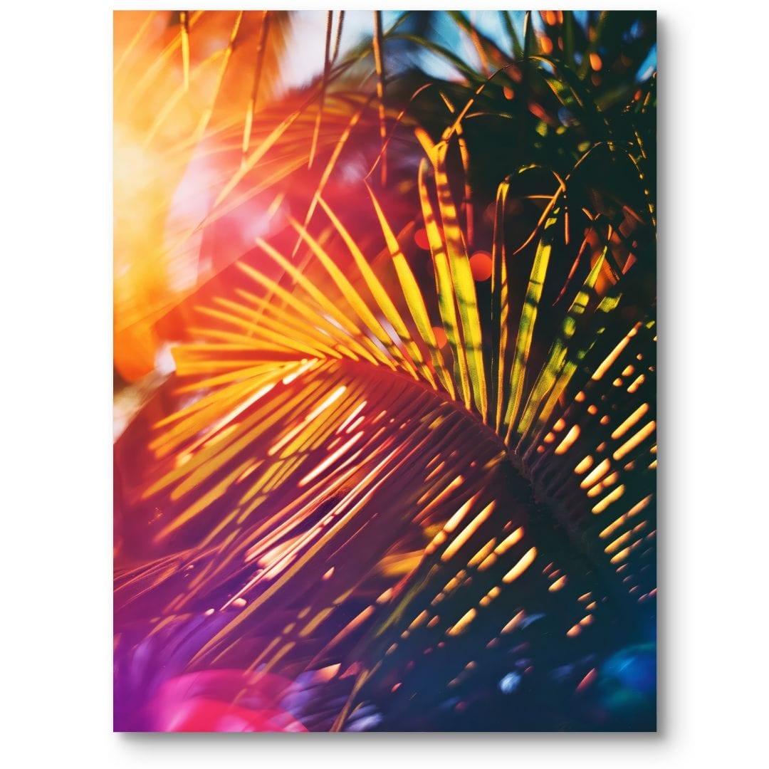 Ten wyjątkowy plakat przenosi nas w sam środek tropikalnego ogrodu, gdzie palmy skąpane są w promieniach intensywnego, barwnego światła. Na pierwszym planie wybijają się pomarańczowe i żółte tony liści, które silnie kontrastują z głębokim, ciemnym tłem, tworząc efekt iście malarski. Zestawienie nasyconych odcieni prowokuje wyobraźnię i pozwala poczuć atmosferę egzotycznego zakątka, pełnego słońca i dynamiki.