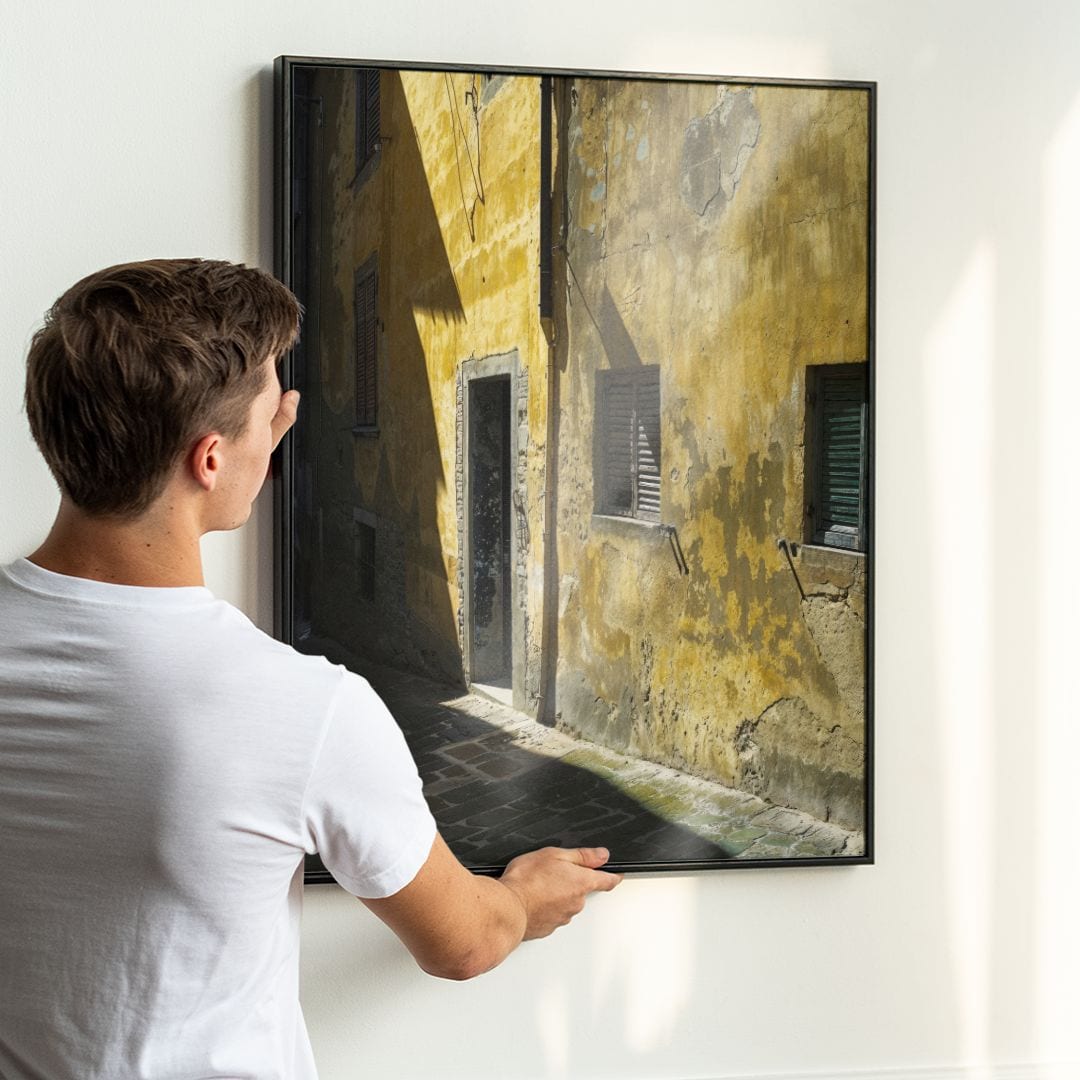 Plakat prezentuje nastrojową włoską uliczkę, malowniczo ujętą w obiektywie. Zniszczone, lecz pełne uroku budynki o charakterystycznych żółtych elewacjach, skrywane w cieniu, wprowadzają sentymentalną atmosferę dawnych lat. Obraz oddaje autentyczność miejsca, przenosząc widza na klimatyczne włoskie uliczki pełne historii.