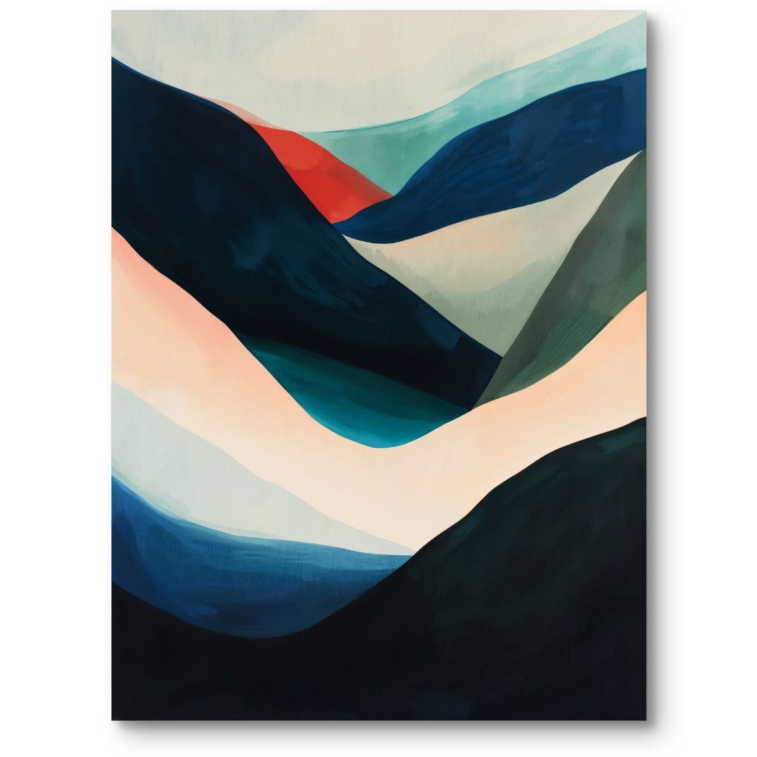 Kompozycja bazuje na rytmicznych, falujących liniach, którym towarzyszą kontrastowe kolory: głęboki granat, wyrazista biel oraz intensywna czerwień. Chłodna paleta barw wprowadza atmosferę wyciszenia i harmonii – doskonałe tło dla współczesnych aranżacji wnętrz.