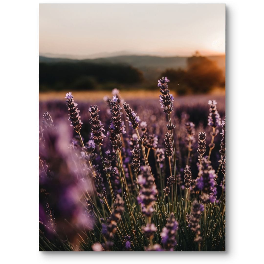 Plakat przedstawia zachwycający widok rozległych pól lawendy skąpanych w ciepłym blasku zachodzącego słońca. Fioletowe kwiaty subtelnie kontrastują z pomarańczowym horyzontem, tworząc niezwykle malowniczą i harmonijną scenerię.