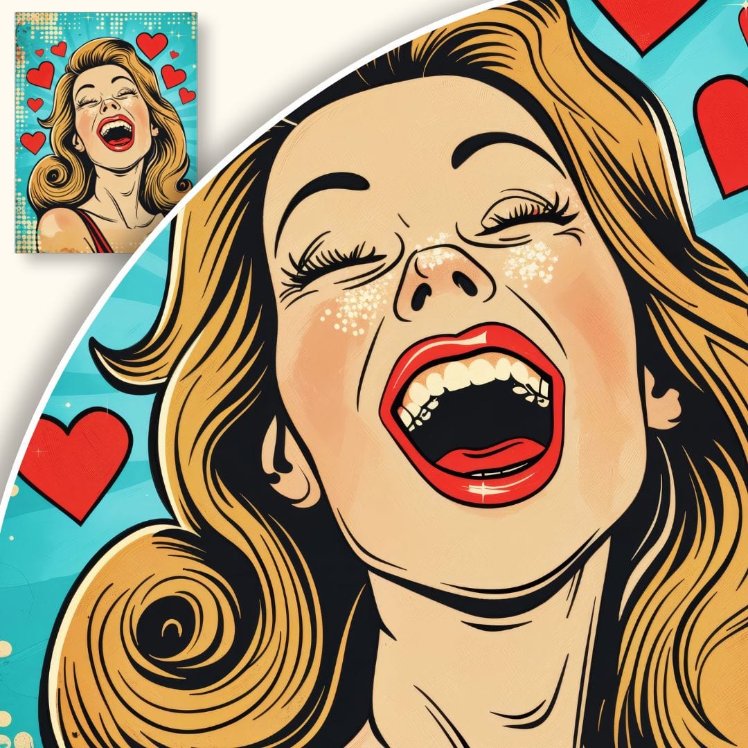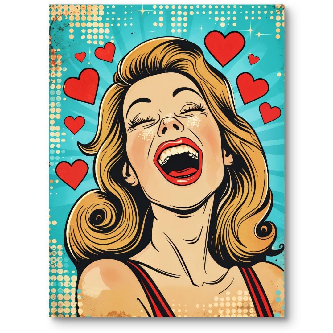 Plakat prezentuje radosną kobietę w stylistyce pop-art, na tle turkusowego nieba dekorowanego czerwonymi sercami. To wyjątkowa kompozycja, która promieniuje energią, optymizmem i miłością, wprowadzając do wnętrza aurę wyjątkowej pozytywności.