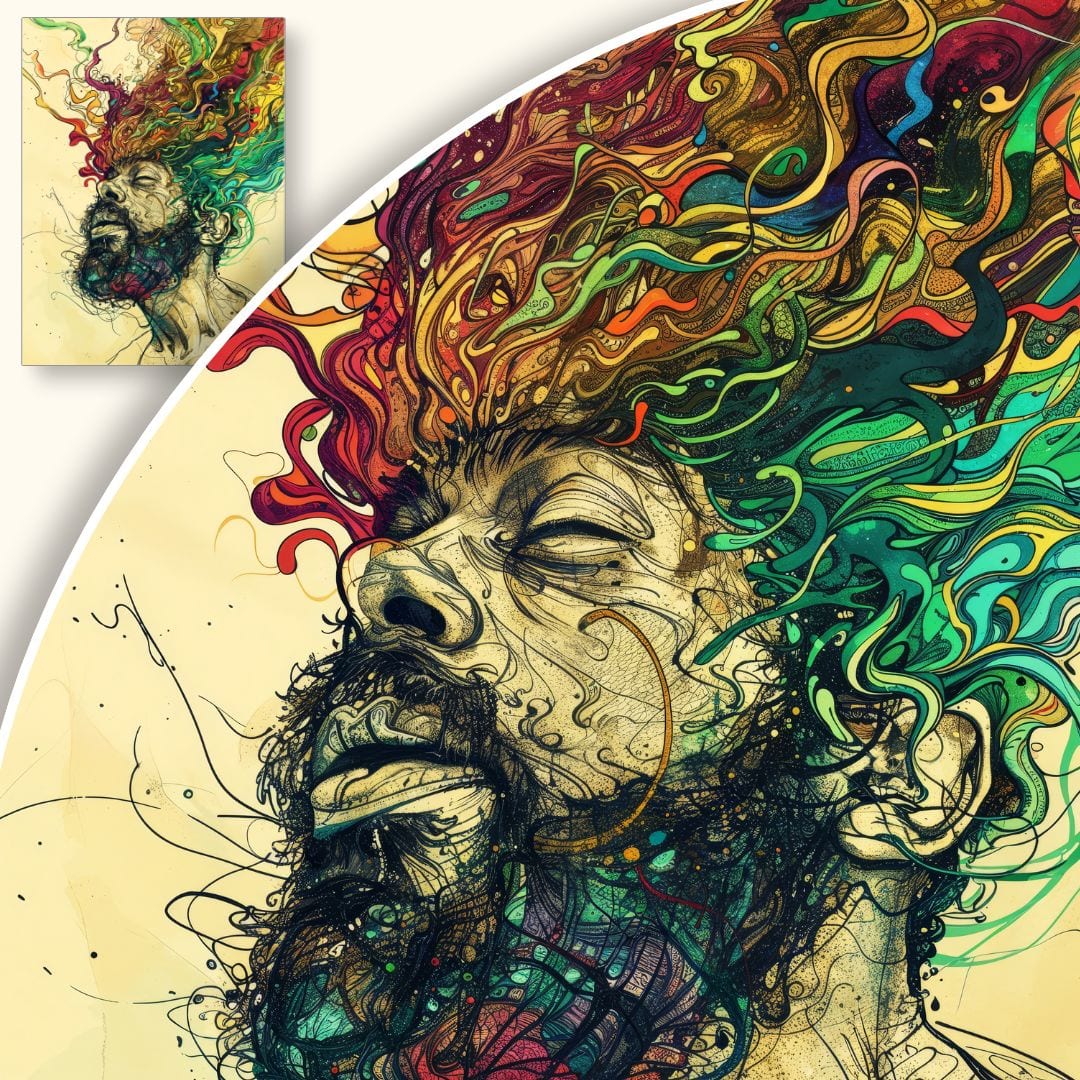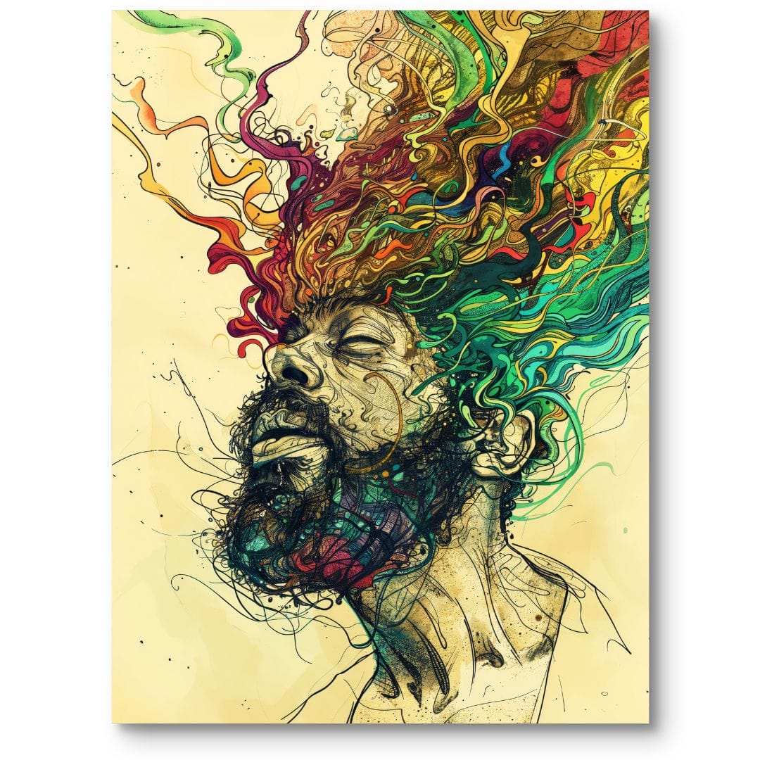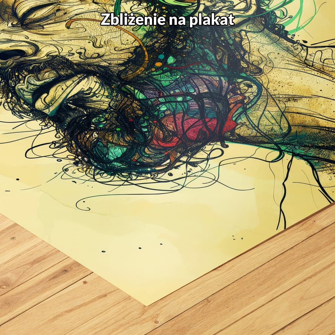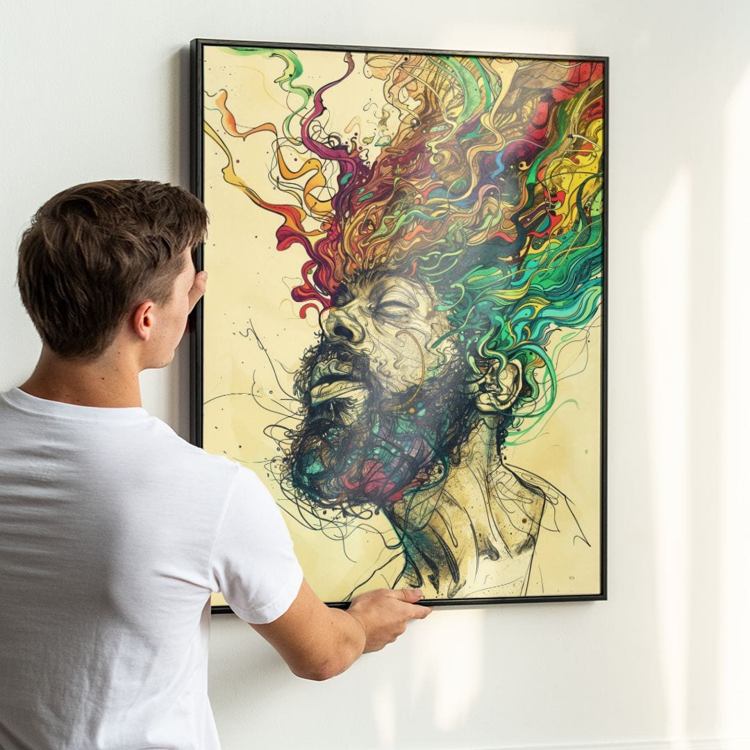 Prezentowany plakat to niezwykle dynamiczny i barwny portret mężczyzny z zamkniętymi oczami, z których wypływają abstrakcyjne, energetyzujące formy i odcienie. Obraz ten staje się wizualną metaforą wewnętrznego świata człowieka – emocji, myśli i inspiracji uchwyconych poprzez ekspresyjne linie oraz wyraziste kolory.