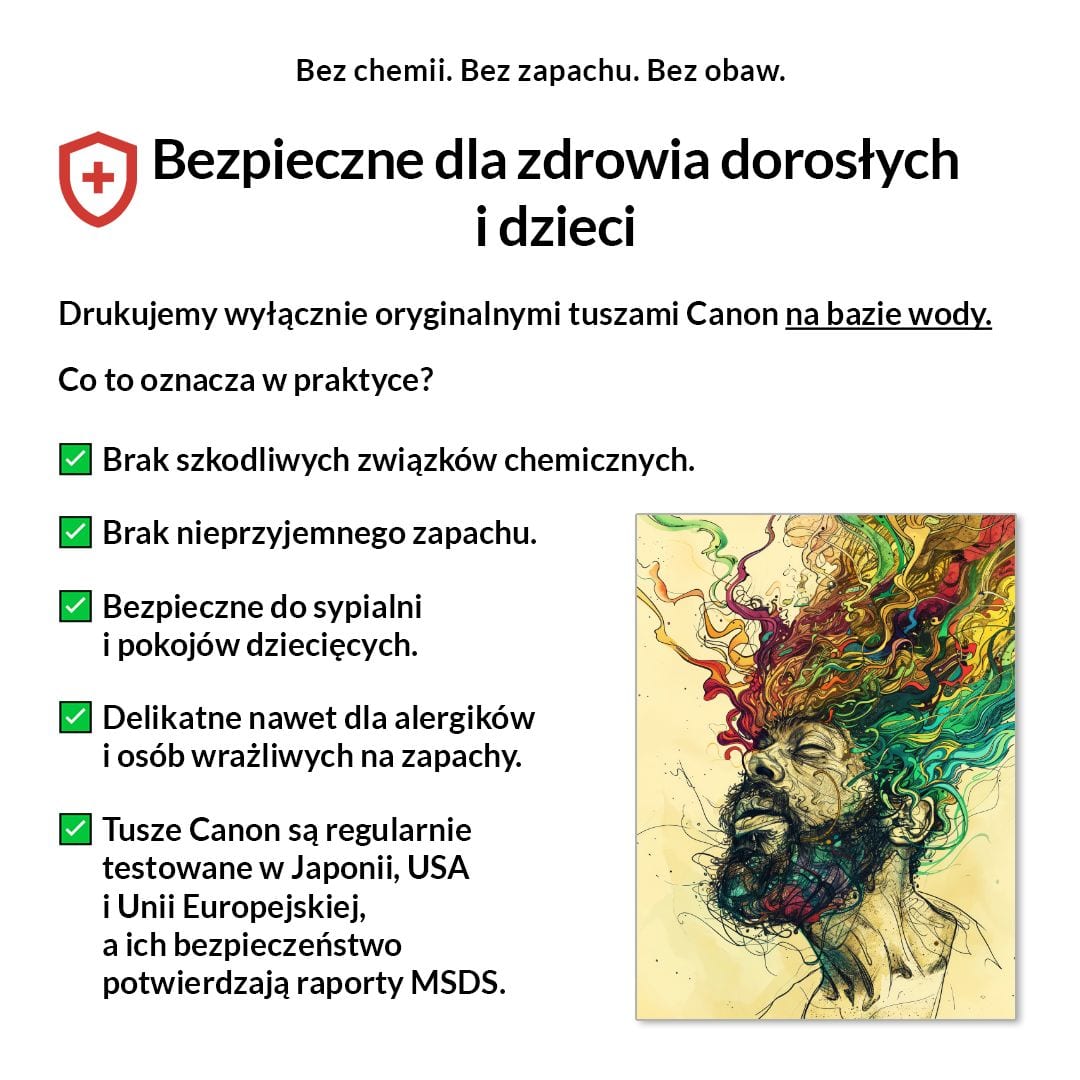 Tak, absolutnie! Drukujemy wyłącznie certyfikowanymi, bezwonnymi tuszami pigmentowymi Canon Lucia Pro na bazie wody. Są one w pełni bezpieczne dla zdrowia, nie zawierają rozpuszczalników i mogą być bez obaw stosowane w sypialniach i pokojach dziecięcych.