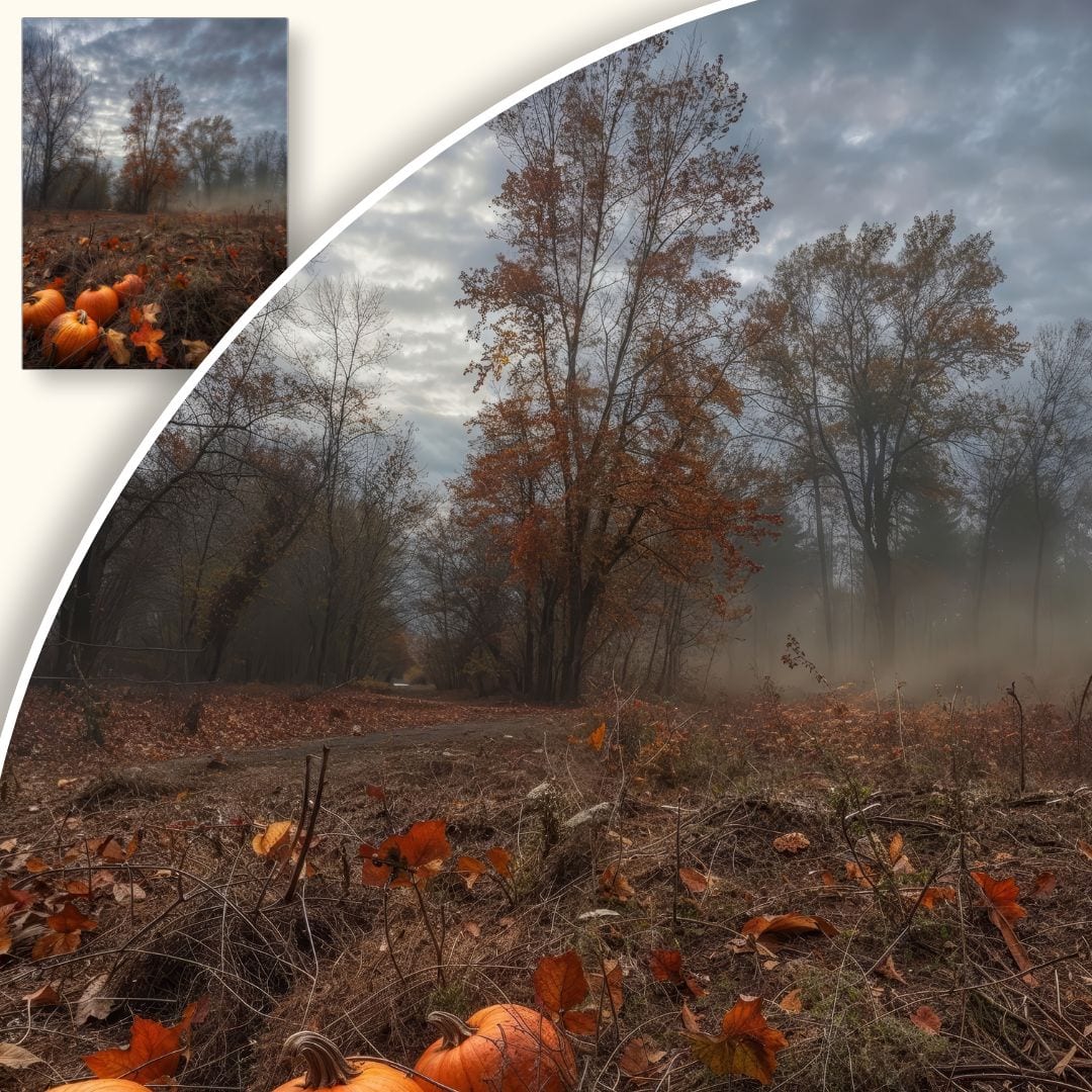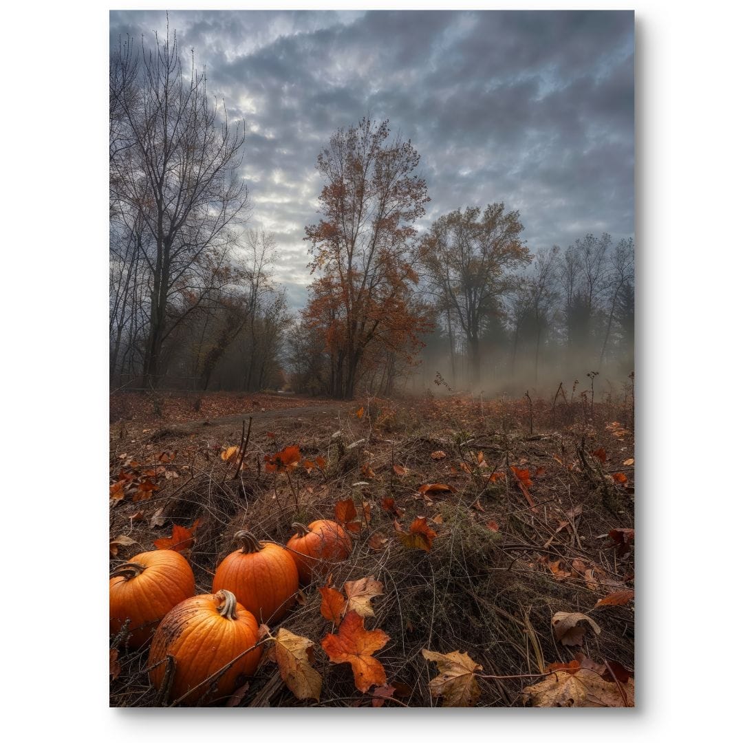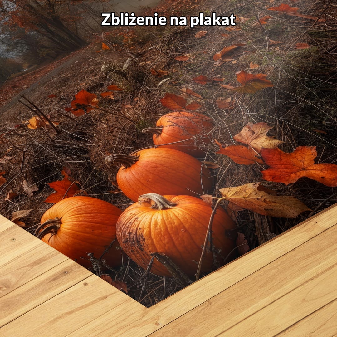Plakat na ścianę ukazuje nastrojowy, jesienny pejzaż, którego centrum stanowią majestatyczne drzewa spowite delikatną, poranną mgłą. Na pierwszym planie dostrzec można dekoracyjne dynie w intensywnych barwach brązu i pomarańczy, dodające całości uroku oraz podkreślające klimat złotej jesieni. Naturalne światło oraz subtelna mgła sprawiają, że motyw emanuje tajemniczością i ciepłem, wprowadzając do wnętrza nutę nostalgii.