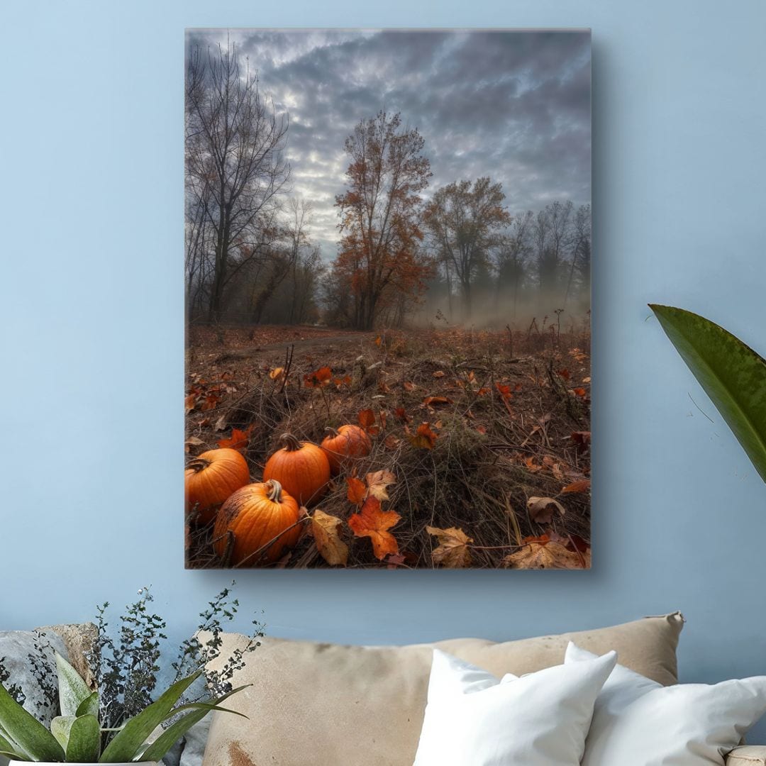 Obraz na ścianę przenosi widza w świat spokojnej jesieni, pełen refleksji nad przemijaniem i pięknem natury. Dynie przypominają o obfitych plonach i radości związanej z jesienią, a opadające liście symbolizują cykliczność życia.
