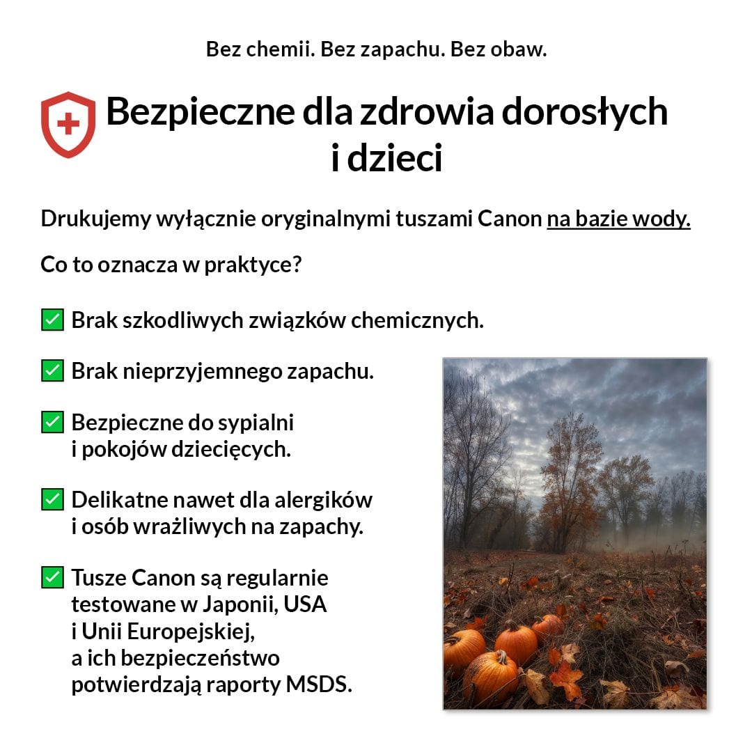 My drukujemy wyłącznie na pigmentowych tuszach Canon LUCIA PRO, bezpiecznych, bezzapachowych i certyfikowanych.